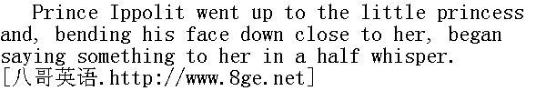 伊波利特公爵走到矮小的公爵夫人近旁,弯下腰来把脸凑近她,轻言细语地对她说些什么话。 Two footmen, one the princess's, the other his own, stood with shawl and redingote waiting till they should finish talking, and listened to their French prattle, incomprehensible to them, with faces that seemed to say that they understood what was being said but would not show it. The princess, as always, talked with a smile and listened laughing. 两名仆人,一名是公爵夫人的仆人,他手中拿着肩巾,另一名是他的仆人,他手上提着长礼服,伫立在那里等候他们把话说完毕。他们听着他们心里不懂的法国话,那神态好像他们懂得似的,可是不想流露出他们听懂的神色。公爵夫人一如平常,笑容可掬地谈吐,听话时面露笑意。 "I'm very glad I didn't go to the ambassador's," Prince Ippolit was saying: "such a bore....A delightful evening it has been, hasn't it? delightful." " 我非常高兴,我没有到公使那里去,"伊波利特公爵说道,"令人纳闷......晚会真美妙,是不是,真美妙?" "They say the ball will be a very fine one," answered the little princess, twitching up her downy little lip. "All the pretty women are to be there." " 有人说,舞会妙极了,"公爵夫人噘起长满茸毛的小嘴唇道,"社团中美貌的女人都要在那里露面。" "Not all, since you won't be there; not all," said Prince Ippolit, laughing gleefully; and snatching the shawl from the footman, shoving him aside as he did so, he began putting it on the little princess. Either from awkwardness or intentionally-no one could have said which-he did not remove his arms for a long while after the shawl had been put on, as it were holding the young woman in his embrace. " 不是所有的女人,因为您就不出席,不是所有女人,"伊波利特公爵说,洋洋得意地大笑,他霍地从仆人手中拿起肩巾,甚至推撞他,把肩巾披在公爵夫人身上。不知是动作不灵活还是蓄意这样做(谁也搞不清是怎么回事),肩巾还披在她身上,他却久久地没有把手放开,俨像在拥抱那个少妇似的。