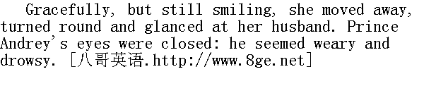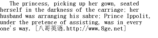 她一直微露笑容,风度优雅地避开他,转过身来望了望丈夫。安德烈公爵阖上了眼睛,他似乎十分困倦,现出昏昏欲睡的神态。 "Are you ready?" he asked his wife, avoiding her eyes. " 您已准备就绪了吧?"他向妻子问道,目光却回避她。 Prince Ippolit hurriedly put on his redingote, which in the latest mode hung down to his heels, and stumbling over it, ran out on to the steps after the princess, whom the footman was assisting into the carriage. 伊波利特公爵急急忙忙地穿上他那件新款式的长过脚后跟的长礼服,有点绊脚地跑到台阶上去追赶公爵夫人,这时分,仆人搀着她坐上马车。 "Princesse, au revoir," he shouted, his tongue tripping like his legs. "Princesse,aurevoir ①."他高声喊道,他的舌头也像两腿被礼服绊住那样,几乎要说不出话来。 ①法语: 公爵夫人,再会。
