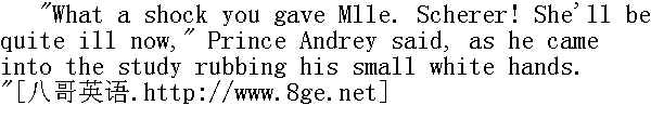 安德烈公爵在沉默片刻之后问道。 "Can you believe it, I still don't know. I don't like either." " 您可以想象,我还不知道啦。这二者我都不喜欢。" "But you must decide on something; you know your father's expecting it." " 可你要知道,总得拿定主意吧?你父亲在期望呢。" At ten years old Pierre had been sent with an abbe as tutor to be educated abroad, and there he remained till he was twenty. When he returned to Moscow, his father had dismissed the tutor and said to the young man: "Now you go to Petersburg, look about you and make your choice. I agree to anything. Here is a letter to Prince Vassily and here is money. Write and tell me everything; I will help you in everything." Pierre had been three months already choosing a career and had not yet made his choice. It was of this choice Prince Andrey spoke to him now. Pierre rubbed his forehead. 皮埃尔从十岁起便随同做家庭教师的神父被送到国外去了,他在国外住到二十岁。当他回到莫斯科以后,他父亲把神父解雇了,并对这个年轻人说道: "你现在就到彼得堡去吧,观光一下,选个职务吧。我什么事情都同意。这是一封写给瓦西里公爵的信,这是给你用的钱。你把各种情况写信告诉我吧,我会在各个方面助你一臂之力。"皮埃尔选择职务选了三个月,可是一事无成。安德烈公爵也和他谈到选择职务这件事。皮埃尔揩了一下额头上的汗。 "But he must be a freemason," he said, meaning the abbe he had seen that evening" 他必然是个共济会会员。"他说道,心里指的是他在一次晚会上见过面的那个神父。.