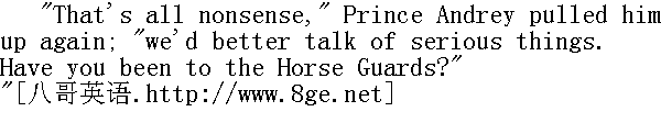 这全是胡言乱语,"安德烈公爵又制止他,说道: "让我们最好谈谈正经事吧。你到过骑兵近卫军没有?......" "No, I haven't; but this is what struck me and I wanted to talk to you about it. This war now is against Napoleon. If it were a war for freedom, I could have understood it, I would have been the first to go into the army; but to help England and Austria against the greatest man in the world-that's not right." " 没有,我没有去过,可是我脑海中想到一件事,要和您谈谈才好。目前这一场战争,是反对拿破仑的战争。假如这是一场争取自由的战争,那我心中就会一明二白,我要头一个去服兵役。可是帮助美国和奥地利去反对世界上一个最伟大的人......这就很不好了。" Prince Andrey simply shrugged his shoulders at Pierre's childish words. He looked as though one really could not answer such absurdities. But in reality it was hard to find any answer to this na?ve question other than the answer Prince Andrey made. "If every one would only fight for his own convictions, there'd be no war," he said. 安德烈公爵对皮埃尔这种稚气的言谈只是耸耸肩膀而已。他做出一副对这种傻话无可回答的神态,诚然,对这种幼稚的问题,只能像安德烈公爵那样作答,真难以作出他种答案。"设若人人只凭信念而战,那就无战争可言了。"他说。 "And a very good thing that would be too," said Pierre. " 这就美不胜言了。"皮埃尔说道。安德烈公爵发出了一阵苦笑。 Prince Andrey smiled ironically. "Very likely it would be a good thing, but it will never come to pass..."" 也许,这真是美不胜言,但是,这种情景永远不会出现......"