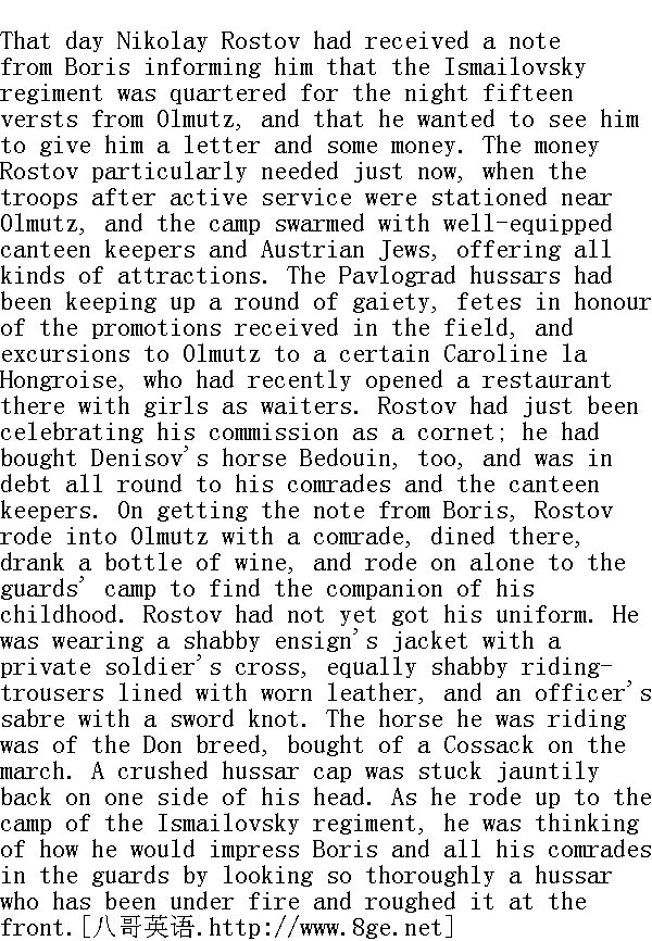 十一月十二日, 驻扎在奥尔米茨附近的库图佐夫的战斗部队, 准备于翌日接受两位皇席--俄皇和奥皇--的检阅。刚从俄国开到的近卫军在离奥尔米茨十五俄里的地方歇宿, 于翌日上午十时以前径赴奥尔米茨阅兵场接受检阅。 这天, 尼古拉·罗斯托夫接到鲍里斯的便函, 通知他说, 伊兹梅洛夫兵团在离奥尔米茨十五俄里的地方歇宿, 鲍里斯正在等候他, 以便把金钱和信件转交给他。正当部队出征归来、在奥尔米茨近郊扎营的时候, 罗斯托夫特别需要钱用。一些随军商贩和奥籍犹太商人充分供应各种富有诱惑力的商品, 挤满了营盘。保罗格勒兵团的官兵相继举行宴会, (藉以)庆贺出征立功受奖, 他们骑马前往奥尔米茨探望新来的匈牙利女人卡罗利娜, 她和一名厨娘在那里开设一间酒肆。不久前罗斯托夫庆贺他提升为骑兵少尉, 他向杰尼索夫买到一匹叫做"贝杜英"的战马, 欠了伙伴和随军商贩的钱, 浑身是债。罗斯托夫接到了鲍里斯的便函, 随同一名伙伴骑马前赴奥尔米茨, 在那里用了一顿午饭, 喝了一瓶葡萄酒, 之后独自一人驰到近卫军营寻找他的童年时代的伙伴。罗斯托夫没有来得及置备军服, 他穿的是一件破烂的佩戴有十字肩章的士官生上衣, 一条同样破烂的, 皮衬磨光了的紧腿马裤, 腰间挂着一柄饰以刀穗的军刀。他骑的那匹马是他在行军时从一个哥萨克手上买来的顿河马, 他很神气地向后歪戴着一顶弄皱了的骠骑兵帽。当他驰近伊兹梅洛夫兵团的营盘时, 心中想道, 他这副身经百战的骠骑兵模样会使鲍里斯和他的伙伴大为惊讶。 The guards had made their march as though it were a pleasure excursion, priding themselves on their smartness and discipline. They moved by short stages, their knapsacks were carried in the transport waggons, and at every halt the Austrian government provided the officers with excellent dinners. The regiments made their entry into towns and their exit from them with bands playing, and, according to the grand duke's order, the whole march had (a point on which the guards prided themselves) been performed by the soldiers in step, the officers too walking in their proper places. Boris had throughout the march walked and stayed with Berg, who was by this time a captain. Berg, who had received his company on the march, had succeeded in gaining the confidence of his superior officers by his conscientiousness and accuracy, and had established his financial position on a very satisfactory basis. Boris had during the same period made the acquaintance of many persons likely to be of use to him, and by means of a letter of recommendation brought from Pierre, had made the acquaintance of Prince Andrey Bolkonsky, through whom he had hopes of obtaining a post on the staff of the commander-in-chief. Berg and Boris, who had rested well after the previous day's march, were sitting smartly and neatly dressed, in the clean quarters assigned them, playing draughts at a round table. Berg was holding between his knees a smoking pipe. Boris, with his characteristic nicety, was building the draughts into a pyramid with his delicate, white fingers, while he waited for Berg to play. He was watching his partner's face, obviously thinking of the game, his attention concentrated, as it always was, on what he was engaged in. 在行军的全程中, 近卫军犹如游园一般, 炫耀着它自己的整洁和纪律。每昼夜的行程很短, 他们便用大车运载行囊;奥国的首长在行军途中给军官们准备十分可口的食物。各个兵团在一片军乐声中出入于城市。军人们遵循大公的命令, 在全程中(近卫军军人引以自豪)自始至终地合着脚步行进, 各个岗位的军官徒步行进。在行军期间, 鲍里斯始终都在现已担任连长的贝格身边。贝格在行军期间接管一个连, 他善于执行命令, 谨慎行事, 已赢得首长们的信任, 他在办理经济事务上也处于有利地位。在行军中鲍里斯广于交际, 结识了一些有助于他的人, 他凭藉皮埃尔的介绍信, 结识了安德烈·博尔孔斯基公爵, 他希望借助于他在总司令部谋得一个职位。贝格和鲍里斯在最后一天行军结束后, 得到了充分的休息, 他们穿得十分整洁, 坐在拨给他们的住房中的一张圆桌前面下棋。贝格在他的双膝之间拿着一根点燃的烟斗。鲍里斯装出一副他特有的谨小慎微的样子, 用他那又白又细的手把棋子摆成小金字塔形, 等待着对手走棋, 一面望着贝格的面孔, 显然他在思忖下棋的游戏, 他一向只是想到他所做的事情。 "Well, how are you going to get out of that?" he said." 喂, 你怎么走得出来?"他说道。 "I am going to try," answered Berg, touching the pieces, and taking his hand away again." 要尽力而为。"贝格回答, 他用手拨动卒子, 又把手放下来了。 At that instant the door opened. 这时候, 门敞开了。
