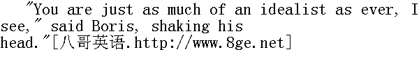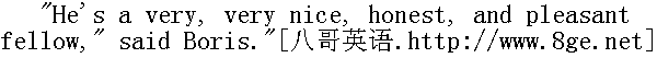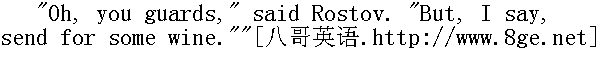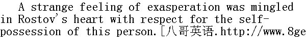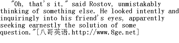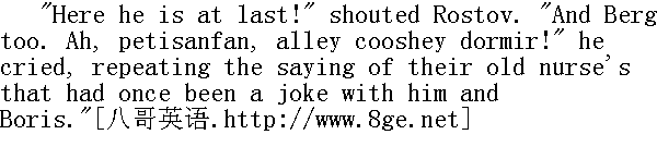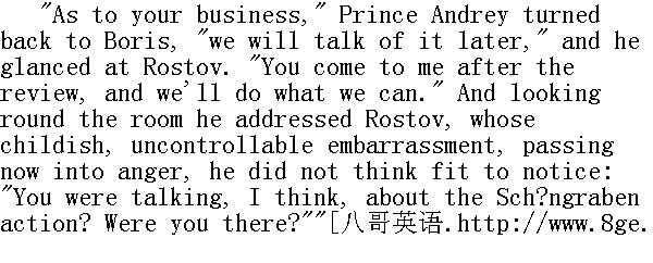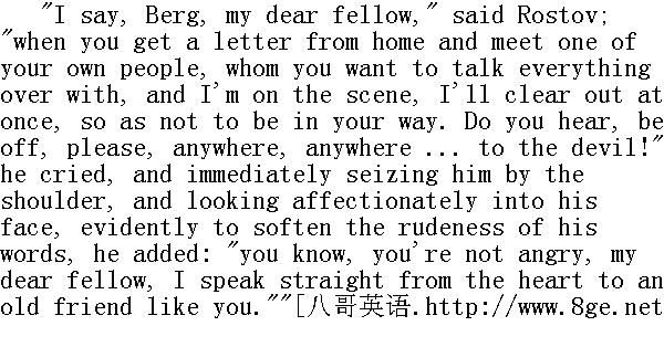 他毕竟在这儿露面了!"罗斯托夫喊道。"贝格也在这儿!哎, 你这个人真是, nemuzahcpah, anenyweqorwnup!①他喊道, 重复着他和鲍里斯从前用以取笑的保姆说的话。 ①保姆说的不通的法语: 孩子们, 去睡觉吧。 "Goodness, how changed you are!" Boris got up to greet Rostov, but as he rose, he did not forget to hold the board, and to put back the falling pieces. He was about to embrace his friend, but Nikolay drew back from him. With that peculiarly youthful feeling of fearing beaten tracks, of wanting to avoid imitation, to express one's feelings in some new way of one's own, so as to escape the forms often conventionally used by one's elders, Nikolay wanted to do something striking on meeting his friend. He wanted somehow to give him a pinch, to give Berg a shove, anything rather than to kiss, as people always did on such occasions. Boris, on the contrary, embraced Rostov in a composed and friendly manner, and gave him three kisses." 我的老天爷!你变得很厉害啊!"鲍里斯站立起来, 向前走去迎接罗斯托夫, 但是在他站立的当儿, 他没有忘记把倒下的棋子扶起来, 放回原处;他想去拥抱自己的朋友, 可是尼古拉回避他了。尼古拉怀有青春时代害怕因循守旧的生活道路的特殊情感。他不愿意模仿别人, 而想按照新的方式, 按照自己的方式来表达情感, 只是不要像长辈那样虚伪地表达情感。因此尼古拉和朋友相会时想做个什么特别的动作。他想捏捏鲍里斯, 推推鲍里斯, 可是他无论怎样都不像大家相会时那样接个吻。而鲍里斯则相反, 他安详而友善地拥抱罗斯托夫, 吻了他三次。 It was almost six months since they had seen each other. And being at the stage when young men take their first steps along the path of life, each found immense changes in the other, quite new reflections of the different society in which they had taken those first steps. Both had changed greatly since they were last together, and both wanted to show as soon as possible what a change had taken place. 他们有半年几乎没有见面了, 在他们这个年纪的时候, 年轻人正在生活道路上迈出第一步, 他们二人发现彼此都有很大的变化, 那即是他们在生活上迈出第一步的那个崭新社会的面貌的反映。从他们最后一次相会以来, 他们二人都有许多变化, 因此他们都想尽快地互相吐露内心发生的变化。 "Ah, you damned floor polishers! Smart and clean, as if you'd been enjoying yourselves; not like us poor devils at the front," said Rostov, with martial swagger, and with baritone notes in his voice that were new to Boris. He pointed to his mud-stained riding-breeches. The German woman of the house popped her head out of a door at Rostov's loud voice." 咳, 你们都是可诅咒的不务正业的人!穿得很鲜艳, 干干净净, 好像从游园会上回来似的, 并不是说我们都是有罪的丘八长官。"罗斯托夫用那使鲍里斯听来觉得不熟悉的男中音说道, 一面摆出军人的架势, 指指他自己穿的那条尽是污泥的紧腿马裤。德国女老板听见罗斯托夫的响亮的嗓音, 便从半开着的门内探出头来。
