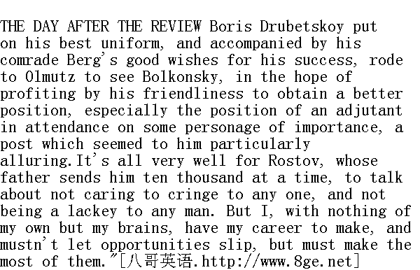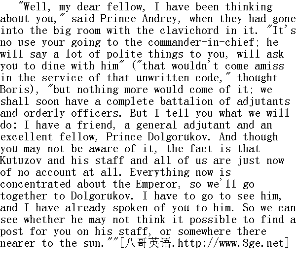 阅兵之后的翌日, 鲍里斯穿着顶好的军服, 领受贝格同志赐予他的事业成功的临别赠言, 前往奥尔米茨拜访博尔孔斯基。他翼望享用博尔孔斯基的垂照, 为自己谋求一个极好的职位, 尤其冀望谋求一个他认为颇具吸引力的军中显要名下的副官职位。"罗斯托夫的父亲一次就给他汇寄万把块卢布, 他轻松愉快, 说他不在任何人面前低三下四, 决不去做任何人的仆役;而我除去自己的头颅以外, 一无所有, 不得不给自己谋求锦绣前程, 获取功名利禄, 时机不可错失, 而应充分利用它。" He did not find Prince Andrey at Olmutz that day. But the sight of Olmutz-where were the headquarters and the diplomatic corps, and where both Emperors with their suites, their households, and their court, were staying-only strengthened his desire to belong to this upper world. 是日, 他在奥尔米茨没有碰见安德烈公爵。大本营和外交使团驻扎在奥尔米茨, 两位皇帝随同侍从--廷臣和近臣均在此地居住。然而奥尔米茨的美景愈益加深了他想属于这个上层世界的心愿。 He knew no one; and in spite of his smart guardsman's uniform, all these exalted persons, racing to and fro about the streets in their elegant carriages, plumes, ribbons, and orders, courtiers and military alike, all seemed to be so immeasurably above him, a little officer in the Guards, as to be not simply unwilling, but positively unable to recognise his existence. At the quarters of the commander-in-chief, Kutuzov, where he asked for Bolkonsky, all the adjutants and even the orderlies looked at him as though they wished to impress on him that a great many officers of his sort came hanging about here, and that they were all heartily sick of seeing them. In spite of this, or rather in consequence of it, he went again the following day, the 15th, after dinner, to Olmutz, and going into the house occupied by Kutuzov, asked for Bolkonsky. Prince Andrey was at home, and Boris was ushered into a large room, probably at some time used for dancing. Now there were five bedsteads in it and furniture of various kinds: a table, chairs, a clavichord. One adjutant was sitting in a Persian dressing-gown writing at a table near the door. Another, the stout, red-faced Nesvitsky, was lying on a bed, his arms under his head, laughing with an officer sitting by the bedside. A third was playing a Vienna waltz on the clavichord, while a fourth lay on the clavichord, humming to the tune. Bolkonsky was not in the room. Not one of these gentlemen changed his position on observing Boris. The one who was writing, on being applied to by Boris, turned round with an air of annoyance, and told him that Bolkonsky was the adjutant on duty, and that he should go to the door to the left, into the reception-room, if he wanted to see him. Boris thanked him, and went to the reception-room. There he found some ten officers and generals. 他不认识什么人, 虽然他穿着讲究的近卫军军服, 但是那些在街上来来往往的高级官员--廷臣和军人却坐着豪华的马车, 佩戴着羽饰、绶带和勋章, 他们比这个近卫军的小军官的地位看来要高得多, 他们不仅不愿意, 而且不会去承认他的存在。他在库图佐夫总司令的住宅打听博尔孔斯基, 所有这些副官, 甚至连勤务兵都轻蔑地望着他, 仿佛向他示意;许多像他这样的军官都到这里来闲逛, 他们真厌烦极了。尽管如此, 或者毋宁说正因为如此, 次日, 即是十五日, 午膳后他又前往奥尔米茨。当他走进库图佐夫的住宅时, 他又打听博尔孔斯基。这时安德烈公爵在家, 有人把鲍里斯带进一间大客厅, 从前这里大概是跳舞的地方, 而今这个大厅里摆着五张床、各种各样的家具、一张桌子、几把椅子和一架击弦古钢琴。一名穿波斯式长衫的副官坐在靠近房门的桌旁写字。另一名副官, 面放红光的胖乎乎的涅斯维茨基枕着自己的手臂, 躺在床上, 正和一名坐在他身边的军官说笑话。第三名副官用击弦古钢琴弹奏维也纳圆舞曲, 第四名副官靠在钢琴上随声和唱。博尔孔斯基不在场。这些先生们中谁也没有注意鲍里斯, 他们并没有改变自己的姿态。有个人正在写字, 鲍里斯向他打听情形, 那人厌烦地把脸转向他, 说博尔孔斯基正在执勤, 如果要见他, 就得从左边那道门进去, 到接待室去。鲍里斯道一声谢, 便朝接待室走去。这时有十来名军官和将军呆在接待室里。 At the moment when Boris entered, Prince Andrey dropping his eye-lids disdainfully (with that peculiar air of courteous weariness which so distinctly says, "If it were not my duty, I would not stay talking to you for a minute"), was listening to an old Russian general with many decorations, who, rigidly erect, almost on tiptoe, was laying some matter before Prince Andrey with the obsequious expression of a common soldier on his purple face. 当鲍里斯走进房间时, 安德烈公爵正在听取那个胸前戴满了勋章的年老的将军的汇报, 他鄙薄地眯缝起眼睛, 这种特别谦虚而又疲倦的神态, 很明显地表示: "如果不是我的职责所在, 我连一分钟也不愿意和您交谈。"那位年老的将军几乎踮着脚尖, 挺直着腰身, 赤红的脸上流露着军人低三下四的表情, 他向安德烈公爵禀告一件什么事。 "Very good, be so kind as to wait a moment," he said to the general in Russian, with that French accent with which he always spoke when he meant to speak disdainfully, and noticing Boris, Prince Andrey took no further notice of the general (who ran after him with entreaties, begging him to hear something more), but nodded to Boris with a bright smile, as he turned towards him. At that moment Boris saw distinctly what he had had an inkling of before, that is, that quite apart from that sub