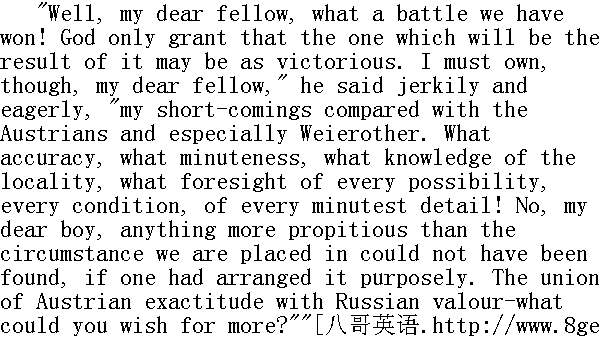 嗬!我亲爱的, 我们经受了怎样的战斗考验啊!但愿上帝保佑, 日后的战事同样会胜利结束。不过, 我亲爱的, "他若断若续地兴致勃勃地说, "我应当在奥国人面前, 特别是在魏罗特尔面前承认我的过错。多么精细, 多么周密, 对地形多么熟悉, 对一切可能性, 一切条件, 一切详情细节都要有先见之明啊!不过, 我亲爱的, 比我们目前更为有利的条件是无法故意虚构出来的。奥国人的精密和俄国人的勇敢相结合, 所向无敌, 您还要怎样呢?" "So an attack has been finally decided upon?" said Bolkonsky." 要是这样, 发动进攻是最后的决定吗?"博尔孔斯基说道。 "And do you know, I fancy, Bonaparte really has lost his head. You know that a letter came from him to-day to the Emperor." Dolgorukov smiled significantly." 您是否知道, 我亲爱的, 我似乎觉得, 波拿巴简直白费口舌。您知道, 今日收到他给皇帝寄来的一封信。"多尔戈鲁科夫意味深长地微微一笑。 "You don't say so! What does he write?" asked Bolkonsky." 真有这么回事!他究竟写了什么呢?"博尔孔斯基问道。 "What can he write? Tradi-ri-di-ra-all simply to gain time. I tell you he's in our hands; that's the fact! But the most amusing part of it all," he said, breaking all at once into a good-natured laugh, "is that they couldn't think how to address an answer to him. If not 'consul,' and of course not 'emperor,' it should be 'general' Bonaparte, it seemed to me."" 他能写什么?还不是老生常谈, 其目的只是赢得时间。我对您说, 他落在我们手上了, 这是真话!可是至为有趣的是, "他忽然和善地笑了起来, 说道, "无论怎样也想不出用什么称呼给他回信。如果不把收件人称为执政官, 当然也不能称为皇帝, 我觉得可以把他称为波拿巴将军。"