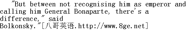 但是, 不承认波拿巴是皇帝和把他称为将军, 这二者之间是有差别的。"博尔孔斯基说道。 "That's just the point," Dolgorukov interrupted quickly, laughing. "You know Bilibin, he's a very clever fellow; he suggested addressing it, 'To the Usurper and Enemy of the Human Race,' " Dolgorukov chuckled merrily." 问题就在那一点上, "多尔戈鲁科夫飞快地说, 他一面发笑, 一面打断他的话。"您可认识比利宾, 他是个十分聪明的人, 他建议这样称呼收件人: '篡夺王位者和人类的公敌'。"多尔戈鲁科夫愉快地哈哈大笑。 "And nothing more?" observed Bolkonsky." 再没有别的称呼吗?"博尔孔斯基说道。 "But still it was Bilibin who found the suitable form of address in earnest. He's both shrewd and witty..."" 比利宾毕竟想出了一个用于通信的头衔。他是一个既机智而又敏锐的人......" "How was it?"" 可不是?什么头衔?"