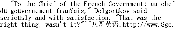 法国政府首脑, Auchefdugouvernementfrancais, "多尔戈鲁科夫公爵严肃而又高兴地说。"很妙, 是不是?" "It was all right, but he will dislike it extremely," observed Bolkonsky." 很妙, 他可真会很不乐意的。"博尔孔斯基说道。 "Oh, extremely! My brother knows him; he's dined more than once with him-nowadays the emperor-in Paris, and used to tell me that he'd never seen a subtler and more crafty diplomat; you know, a combination of French adroitness and the Italian actor-faculty! You know the anecdote about Bonaparte and Count Markov? Count Markov was the only person who knew how to treat him. You know the story of the handkerchief? It's a gem!" And the talkative Dolgorukov turning from Boris to Prince Andrey told the story of how Bonaparte, to test Markov, our ambassador, had purposely dropped his handkerchief before him, and had stood looking at him, probably expecting Markov to pick it up for him, and how Markov promptly dropped his own beside it, and had picked up his own without touching Bonaparte's." 噢, 会很不乐意的!我的哥哥认识他, 我哥哥不止一次在他(当今的皇上)那里用膳, 那时候他们都在巴黎, 我哥哥对我说, 他没有见过比波拿巴更加机灵而且敏锐的外交家。您知道, 他是一个既有法国人的灵活, 又有意大利人的虚情假意的外交家!您知道他和马尔科夫伯爵之间的趣闻吗?只有马尔科夫伯爵一人擅长于同他打交道。您知道手绢的故事吗?妙不可言!"喜欢谈话的多尔戈鲁科夫时而把脸转向鲍里斯, 时而把脸转向安德烈公爵, 叙述波拿巴试图考验一下我们的公使马尔科夫。波拿巴在他面前故意扔下一条手绢, 他停步了, 瞪着眼睛望着他, 大概是等待马尔科夫帮忙, 替他捡起手绢来, 马尔科夫马上也在身边扔下一条自己的手绢, 他捡起自己的手绢, 没有去捡波拿巴的手绢。" "Capital," said Bolkonsky. "But, prince, I have come to you as a petitioner in behalf of this young friend. You see ..." But before Prince Andrey could finish, an adjutant came into the room to summon Prince Dolgorukov to the Emperor. "Charmant "①博尔孔斯基说道, "公爵, 请您听我说, 我到您这里来是替这个年轻人求情的。您知不知道这是怎么回事吗?......" 可是安德烈公爵来不及把话说完, 就有一名副官走进房里来, 喊多尔戈鲁科夫去觐见皇帝。 "Ah, how annoying!" said Dolgorukov, getting up hurriedly and shaking hands with Prince Andrey and Boris. "You know I shall be very glad to do all that depends on me both for you and for this charming young man." Once more he shook hands with Boris with an expression of good-natured, genuine, heedless gaiety. "But you see ... another time!"" 唉, 多么懊恼!"多尔戈鲁科夫连忙站起来, 握着安德烈公爵和鲍里斯的手, 说, "您知道, 我为您和这个可爱的年轻人办到由我决定的一切事情, 我感到非常高兴。"他带着温和而诚挚、活泼而轻率的表情, 再一次地握握鲍里斯的手。"可是你们都明白, 下次再见吧!" Boris was excited by the thought of being so close to the higher powers, as he felt himself to be at that instant. He was conscious here of being in contact with the springs that controlled all those vast movements of the masses, of which in his regiment he felt himself a tiny, humble, and insignificant part. They followed Prince Dolgorukov out into the corridor and met (coming out of the door of the Tsar's room at which Dolgorukov went in) a short man in civilian dress with a shrewd face and a sharply projecting lower jaw, which, without spoiling his face, gave him a peculiar alertness and shiftiness of expression. This short man nodded to Dolgorukov, as if he were an intimate friend, and stared with an intently cold gaze at Prince Andrey, walking straight towards him and apparently expecting him to bow or move out of his way. Prince Andrey did neither; there was a vindictive look on his face, and the short young man turned away and walked at the side of the corridor. 鲍里斯感到, 这时候他正处在当权的上层人士的控制下, 他想到要和这些当权人士接近, 心里十分激动。他意识到他自己在这里要跟那指挥广大群众活动的发条打交道, 他觉得他在自己的兵团里只是群众之中的一个唯命是从的微不足道的小零件。他们跟在多尔戈鲁科夫公爵后面来到走廊上, 遇见一个从房门里走出来的(多尔戈鲁科夫正是走进国王的这道房门的)身材矮小的穿着便服的人, 他长着一副显得聪颖的面孔, 颌骨明显地向前突出, 不过无损于他的面容, 它反而使他赋有一种特别灵活的面部表情。这个身材矮小的人就像对自己人那样, 对多尔戈鲁科夫点点头, 他用他那冷淡的目光开始凝视安德烈公爵, 一面径直地向他走去, 看样子他在等待安德烈公爵向他鞠躬行礼, 或者给他让路。安德烈公爵既没有鞠躬, 也没有让路, 他脸上流露着愤恨的表情, 于是这个年轻人转过身去, 紧靠着走廊边上走过去了。 "Who's that?" asked Boris." 他是谁呀?"鲍里斯问道。 "That's one of the most remarkable men-and the most unpleasant to me. The minister of foreign affairs, Prince Adam Tchartorizhsky.""Those are the men," added Bolkonsky with a sigh which he could not suppress, as they went out of the palace, "those are the men who decide the fates of nations."" 他是个最出色的, 但却是我最厌恶的人。他是外交大臣亚当·恰尔托里日斯基公爵。正是这些人, "他们走出皇宫时, 博尔孔斯基禁不住叹了口气, 说道, "正是这些人来决定各族人民命运的。"