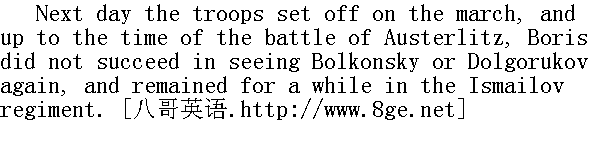 翌日, 部队出征了。在奥斯特利茨战役结束之前, 鲍里斯既来不及访问博尔孔斯基, 也来不及访问多尔戈鲁科夫, 他在伊兹梅洛夫兵团还呆了一段时间。