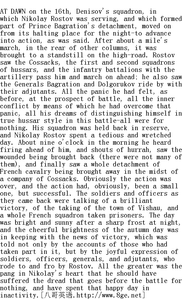 十六日凌晨, 尼古拉·罗斯托夫所服役的那个隶属于巴格拉季翁公爵的队伍的杰尼索夫所指挥的骑兵连从宿营地点启行, 参与一次战役, 据说, 骑兵连追随其他纵队之后已骑行一俄里左右, 在大路上遇阻, 停止前进了。罗斯托夫看见, 哥萨克兵、第一第二骠骑兵连和配备有炮队的步兵营从他身边向前推进。巴格拉季翁和多尔戈鲁科夫二位将军偕同副官骑着战马走过去了。像从前那样在战斗前所经受的恐惧、他用以克服这种恐惧的内心斗争、他以骠骑兵的姿态在这次战役中荣立战功的理想, 这一切成了泡影。他们的骑兵连被留下来充当后备, 尼古拉·罗斯托夫愁闷地过了一天。上午八点多钟, 他听见前面的枪声、"乌拉"声, 他看见从前线送回的伤兵(他们为数不多), 最后他看见, 数以百计的哥萨克在中途押送一队法国骑兵。显然这次战斗结束了, 显然战斗的规模不大, 但是可谓马到成功。前线回来的官兵述说辉煌的胜利、维绍市的攻克、整整一个法国骑兵连的被俘。在一夜的霜冻之后, 白昼的天气明朗, 阳光灿烂令人愉快的秋日和胜利的佳音融合为一体了, 不仅是参加战斗的官兵传播胜利的佳音, 而且那些骑着战马在罗斯托夫身边来回地奔走的士兵、军官、将军和副官的面部表情也透露了这个消息。这就使得尼古拉的内心疼痛得更为剧烈, 他徒然地经受了一次战斗前的恐惧, 在这个愉快的日子他消极无为。 "Rostov, come here, let's drink 'begone, dull care!' " shouted Denisov, sitting at the roadside before a bottle and some edibles. The officers gathered in a ring, eating and talking, round Denisov's wine-case." 罗斯托夫, 请到这里来, 我们干一杯, 解解愁吧!"杰尼索夫喊道, 在路边上坐下来, 他面前摆着军用水壶和下酒的冷菜。几个军官在杰尼索夫的路菜筒旁边围成一圈, 一面用冷菜下酒, 一面聊天。 "Here they're bringing another!" said one of the officers, pointing to a French prisoner, a dragoon, who was being led on foot by two Cossacks. One of them was leading by the bridle the prisoner's horse, a tall and beautiful French beast." 瞧, 又押来一个啊!"有一名军官指着由两个哥萨克兵步押送的一个被俘的法国龙骑兵时, 说道。其中一人牵着一匹从俘虏手上夺来的肥大而美丽的法国战马。 "Sell the horse?" Denisov called to the Cossacks." 把这匹马卖掉吧!"杰尼索夫对那个哥萨克兵大声喊道。 "If you will, your honour."" 大人, 好吧......"