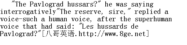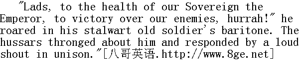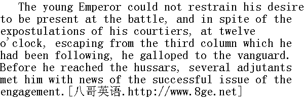 年青的皇帝按捺不住, 他很想参加战斗, 不顾廷臣的一再进谏, 十二点钟离开了他所殿后的第三纵队, 向后卫部队疾驰而去。在几名副官尚未追上骠骑兵之际, 他们便带着战斗顺利结束的消息来迎接国王。 The action, which had simply consisted in the capture of a squadron of the French, was magnified into a brilliant victory over the enemy, and so the Tsar and the whole army believed, especially while the smoke still hung over the field of battle, that the French had been defeated, and had been forced to retreat against their will. A few minutes after the Tsar had galloped on, the division of the Pavlograd hussars received orders to move forward. In Vishau itself, a little German town, Rostov saw the Tsar once more. In the market-place of the town where there had been rather a heavy firing before the Tsar's arrival, lay several dead and wounded soldiers, whom there had not been time to pick up. The Tsar, surrounded by his suite of officers and courtiers, was mounted on a different horse from the one he had ridden at the review, a chestnut English thoroughbred. Bending on one side with a graceful gesture, holding a gold field-glass to his eyes, he was looking at a soldier lying on his face with a blood-stained and uncovered head. The wounded soldier was an object so impure, so grim, and so revolting, that Rostov was shocked at his being near the Emperor. Rostov saw how the Tsar's stooping shoulders shuddered, as though a cold shiver had passed over them, how his left foot convulsively pressed the spur into the horse's side, and how the trained horse looked round indifferently and did not stir. An adjutant dismounting lifted the soldier up under his arms, and began laying him on a stretcher that came up. The soldier groaned. 这次仅仅俘获一个法军骑兵连的战役, 被认为是击溃法军的一次辉煌的胜利, 因此国君和全军, 尤其是在战场上的硝烟尚未消散的时候, 都深信法军败北, 不得不撤退。国王走过之后几分钟内, 他们要求保罗格勒兵团的骑兵营向前推进。在维绍--德意志的小市镇, 罗斯托夫又一次看见国王。国王到达前, 市镇广场上发生过相当猛烈的对射, 那里躺着几具来不及运走的尸体和几个伤兵。国王被一群文武侍从簇拥着, 他骑着一匹和阅兵时所骑的不同的英国式的枣红色母马, 他侧着身子, 用那优美的姿势执着单目眼镜, 把它举到眼前, 不停地望着那个匍匐于地、未戴高筒军帽、头上鲜血淋漓的士兵。这个伤兵非常邋遢、粗野、可恶, 他置身于国王附近, 这使罗斯托夫深感委屈。罗斯托夫看见国王的微微向前弯下的肩头颤栗了一下, 仿佛打了个寒噤, 看见他的左脚开始痉挛地用马刺刺着马的肋部, 这匹受了训练的战马冷淡地东张西望, 它呆在原地不动。一名副官下了马, 搀扶起这个士兵, 把他放在他面前的担架上, 士兵呻吟起来了。"静一点, 静一点, 难道不能安静一点么?"国王看起来比这个行将就木的士兵更难受, 于是骑马走开了。 "Gently, gently, can't you do it more gently?" said the Tsar, apparently suffering more than the dying soldier, and he rode away. 罗斯托夫看见国王的眼睛里噙满着泪水, 并听见他在走开的时候, 用法国话对恰尔托里日斯基说: Rostov saw the tears in the Tsar's eyes, and heard him say in French to Tchartorizhsky, as he rode off: "What an awful thing war is, what an awful thing!" " 战争是一件多么可怖的事啊, 多么可怖的事啊!quelleter-riblechosequelaguerre!"① The forces of the vanguard were posted before Vishau in sight of the enemy's line, which had been all day retreating before us at the slightest exchange of shots. The Tsar's thanks were conveyed to the vanguard, rewards were promised, and a double allowance of vodka was served out to the men. Even more gaily than on the previous night the bivouac fires crackled, and the soldiers sang their songs. Denisov on that night celebrated his promotion to major, and, towards the end of the carousal, after a good deal of drinking, Rostov proposed a toast to the health of the Emperor, but "not our Sovereign the Emperor, as they say at official dinners," said he, "but to the health of the Emperor, the good, enchanting, great man, let us drink to his health, and to a decisive victory over the French!" 一天之内, 敌方的散兵线在不剧烈的对射时向我方让步, 因此, 我方的前卫部队就在维绍市前面扎营。国王向前卫部队表示谢意, 并且答应授奖, 给每人都发两份伏特加酒。这时分人人觉得比前夕更加开心, 营火发出噼啪的响声, 传来士兵的歌声。杰尼索夫这天夜里庆祝他被提升为少校军官, 罗斯托夫已经喝得相当多了, 酒宴结束时他为祝贺国王(而不是皇帝陛下)健康而干杯, 这和正式宴会上大家的说法有所不同, 他说道, "为祝贺仁慈、伟大、令人赞赏的国王健康而干杯, 我们为他的健康而干杯, 为我军必胜法军必败而干杯!" "If we fought before," said he, "and would not yield an inch before the French, as at Sch?ngraben, what will it be now when he is at our head? We will all die, we will gladly die for him. Eh, gentlemen? Perhaps I'm not saying it right. I've drunk a good deal, but that's how I feel, and you do too. To the health of Alexander the First! Hurrah!"" 既然我们从前打过仗, "他说, "而且没有放走法国佬, 正像申格拉本市郊之战那样。国王正在前面督阵, 眼前会出现什么局面呢?我们都去捐躯, 高兴地为他而捐躯。先生们, 对吗?也许我不要这样说, 我喝得太多了, 不过我有这种感觉, 你们也有这种感觉。为亚历山大一世的健康干杯!乌拉!" "Hurrah!" rang out the cheery voices of the officers. And the old captain Kirsten shouted no less heartily and sincerely