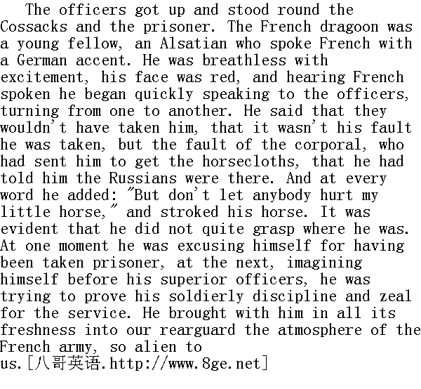 军官们站立起来, 把几个哥萨克兵和一个被俘的法国人围在中间。法国龙骑兵是个挺棒的小伙子, 阿尔萨斯人, 带着德国口音说法国话。他激动得上气不接下气, 满脸通红, 一听见法国话, 就忽而把脸转向这个军官, 忽而把脸转向那个军官, 匆促地讲起话来。他说本来抓不到他, 他被人抓到不是他的过错, 而是那个派他去取马被的Lecapoval(班长)的过错, 他对他说, 俄国人已经呆在那里了。他在每句话上补充一句话: Maisqu'onnefassepasdemalamonpetitcheval, ①一面抚摩自己的马。由此可见, 他不太明白, 他置身于何处。他时而认为他被俘的事是可以原谅的, 时而以为自己的首长就在面前, 并且向首长表白他那大兵的勤恳和对执勤的关心。他把我们感到陌生的法国军队的新气氛带到了我们的后卫部队。 ①法语: 怜悯怜悯我的小马吧。 The Cossacks sold the horse for two gold pieces, and Rostov, being the richest of the officers since he had received money from home, bought it. 几个哥萨克卖掉一匹马, 挣到两枚金卢布。罗斯托夫收到家中寄来的钱, 现在是军官中的一个最富有的人, 他买下了这匹马。 "Be good to the little horse!" the Alsatian said with simple-hearted good-nature to Rostov, when the horse was handed to the hussar. "Maisqu'onnefassepasdemalamonpetitcheval" ①当这匹马转交给骠骑兵后, 阿尔萨斯人和善地对罗斯托夫说。 Rostov smiling, soothed the dragoon, and gave him money. 罗斯托夫面露笑容, 安慰这个龙骑兵, 把钱给他了。 "Alley! Alley!" said the Cossack, touching the prisoner's arm to make him go on." 喂, 喂, 走吧!"哥萨克兵说道, 一面触动着俘虏的手臂, 要他继续向前走。 "The Emperor! the Emperor!" was suddenly heard among the hussars. Everything was bustle and hurry, and Rostov saw behind them on the road several horsemen riding up with white plumes in their hats. In a single moment all were in their places and eagerly expectant." 国王!国王!"忽然, 骠骑兵之间传来一阵呼喊声。大伙儿开始跑步, 手忙脚乱, 罗斯托夫看见他后面的大路上有几个戴着白色帽缨的渐渐驰近的骑者。大伙儿呆在原地等候着。 Rostov had no memory and no consciousness of how he ran to his post and got on his horse. Instantly his regret at not taking part in the battle, his humdrum mood among the men he saw every day-all was gone; instantly all thought of self had vanished. He was entirely absorbed in the feeling of happiness at the Tsar's being near. His nearness alone made up to him by itself, he felt, for the loss of the whole day. He was happy, as a lover is happy when the moment of the longed-for meeting has come. Not daring to look round from the front line, by an ecstatic instinct without looking round, he felt his approach. And he felt it not only from the sound of the tramping hoofs of the approaching cavalcade, he felt it because as the Tsar came nearer everything grew brighter, more joyful and significant, and more festive. Nearer and nearer moved this sun, as he seemed to Rostov, shedding around him rays of mild and majestic light, and now he felt himself enfolded in that radiance, he heard his voice-that voice caressing, calm, majestic, and yet so simple. A deathlike silence had come-as seemed to Rostov fitting-and in that silence he heard the sound of the Tsar's voice. 罗斯托夫不记得也不觉得, 他是怎样跑至原处并且骑上战马的。他因为没有参加战斗而产生的遗憾、他在看腻了的人们中间产生的枯燥情绪霎时间消失殆尽, 一切只顾自己的想法也转瞬间消逝了。一种因为国王行将驾临而产生的幸福之感几乎把他吞没了。他觉得他消磨了当天的时光, 而仅因国王行将驾临而获得抵偿。他觉得非常幸福, 就像个情夫等到了期待已久的约会似的。他不敢在队列中环顾, 虽然他并未左顾右盼, 而他却以狂欢的嗅觉闻到了他的驾临。他所以具有这样的感觉, 不仅仅因为他听见渐渐驰近的骑行者的得得的马蹄声, 而且因为随着国王的驾临, 他的四遭显得更加亮堂, 更加欢快, 更加富有重大意义, 而且更加带有节日的气氛。罗斯托夫心目中的这轮太阳离他越来越近, 它在自己的四周放射出温和的壮丽的光芒, 他终于觉得他自己已被这种光芒笼罩住了, 他听见国王的声音, 这种既温和而又平静, 既庄严而又纯朴的声音。正与罗斯托夫的预感相符合, 死一般的沉寂降临了, 并且在这一片沉寂中可以听见国王的声音。