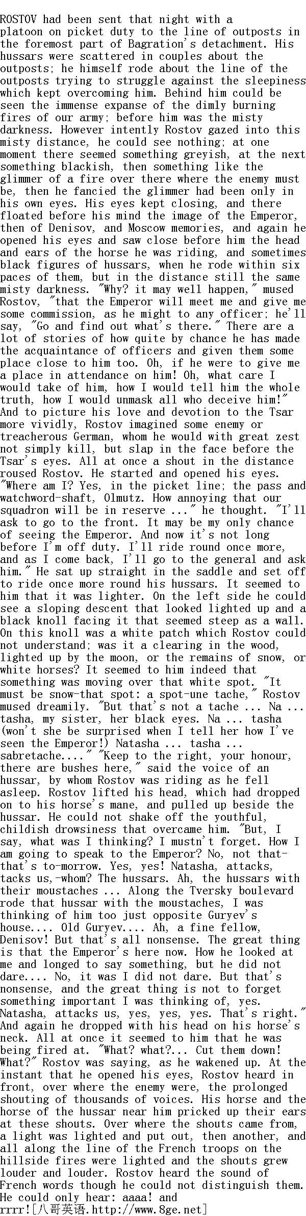 这天夜里, 罗斯托夫到了巴格拉季翁的部队前面的侧防散兵线上。他的骠骑兵成对地分布在这条散兵线上;他本人沿着散兵线来回地骑行, 极力地克服难以克服的睡意。在他后面可以看见我军的半明不灭的篝火在雾霭中占有一大片空地;他前面弥漫着昏暗的雾霭。不管罗斯托夫怎样仔细察看雾气沉沉的远方, 他什么也看不见。那里时而是露出灰蒙蒙的东西, 时而仿佛显露出黑乎乎的东西, 时而在敌人盘踞的那个地方仿佛火光闪烁, 时而他心中想到, 这不过是他的眼睛在闪闪发光。他闭上眼睛, 脑海中时而想到国王, 时而想到杰尼索夫, 时而浮现出莫斯科的回忆, 他又赶快睁开眼睛, 在自己前面不远的地方看见他骑的那匹战马的头颅和耳朵, 在六步路远的地方他快要碰上骠骑兵, 他有时看见他们的黑乎乎的身影;而在远处看见的仍然是昏暗的雾霭。"究竟为什么?"罗斯托夫想道, "可能是国王遇见我, 就像遇见任何一个军官那样, 交给我一项任务, "他说: "你去打听那里的情况。他们讲过许多话, 说他全属偶然地认识了某个军官, 并使他成为自己的亲信。如果他把我变成他的亲信, 那会怎样啊!啊, 我真要捍卫他, 我真要向他说出全部实话, 我真要揭露那些和他作对的骗子手!"罗斯托夫为了要生动地想象他对国王的爱戴和忠诚, 于是脑海中想象到一个敌人或是德国骗子手出现的情景。他不仅要痛快地把他杀死, 而且要在国王眼前提他的耳光。忽然一阵远方的喊声惊醒了罗斯托夫, 他哆嗦一下, 睁开了眼睛。 "我在哪里啊!是的, 在散兵线上, 口号和暗号是'车辕杆, 奥尔米茨。'令人多么懊丧, 我们的骑兵连明日要充当后备队了。"他想了想, "我请求参战。这也许是拜见国王的唯一的机会。是的, 从现在算起, 不要过多久就得换班了。我再去巡逻一遍, 回来以后立即到将军那里去, 向他提出请求。"他在马鞍上纠正了姿势, 就策马放行, 再去巡视自己的骠骑兵。他似乎觉得天更亮了。在左方可以看见被月亮照耀的慢坡, 像垣墙一般陡峭, 耸立于对方的黑魆魆的山岗。这个山岗上有个罗斯托夫根本没法弄明白的白点, 是否是被月牙儿照亮的林间空地, 抑或是一堆残留的积雪, 抑或是白垩垩的房屋?他甚至觉得, 有什么东西开始沿着这个白点慢慢地移动。"这个白点也许是积雪, "法文的"点子"是"unetache, "罗斯托夫想道。"这不是塔什......""娜塔莎, 妹妹, 一双乌黑的眼睛, 娜......塔什卡, (当我告诉她我看见国王, 她会多么惊讶啊!)带上娜塔什卡......图囊......"阁下, 靠右边点儿, 要不然, 真会碰着这儿的灌木林, "传来骠骑兵的说话声, 罗斯托夫昏昏欲睡地从他身边走过去。罗斯托夫抬起他那低垂在马鬃上的头, 在骠骑兵身边停步了。这个孩提般的年轻人非常想睡觉。"哦, 我究竟想什么呀?--可不要忘记。我将要怎样和国王谈话?不是, 不是这码事, 是明天的事。是的, 是的, 踩踩塔什卡......使我们迟钝--使谁迟钝啊?使骠骑兵迟钝。骠骑兵和大胡子......这个蓄着胡髭的骠骑兵沿着特维尔大街骑行, 我还想起他来了, 就在古里耶夫的住宅对面......古里耶夫老头子......嗨, 杰尼索夫是个很不错的人!不过这全是废话。主要的是, 现在国王就在这儿。他是怎样看待我的, 我心里很想对他说点什么话, 可是他不敢......不对, 是我不敢。这都是废话, 主要的是, 可不要忘记我心里想的要紧的事, 这没有错。踩踩塔什卡, 使我们迟钝, 对, 对, 对。这很妙。"他又把头低垂在战马的颈上。他突然觉得, 有人在向他射击。"是怎么回事?是怎么回事?是怎么回事?......杀吧!是怎么回事?......"罗斯托夫清醒后说道。在罗斯托夫睁开眼睛的那转瞬之间, 他听见前面的敌军那边的千千万万人的曼声的叫喊。他的一匹马、站在他身边的骠骑兵的一匹马都竖起耳朵来倾听这一片喊声。在喊声传来的那个地方, 火光闪耀, 旋即熄灭, 然后又点起火来, 火光在那山头上的法军的全线闪耀起来, 喊声愈加响亮。罗斯托夫听见法国人的说话声, 但他没法听清晰。许多人正在叽叽喳喳地谈话。现在可以听见"啊啊啊、啦啦啦"的声音。 "What is it? What do you think?" Rostov said to the hussar near him. "That's in the enemy's camp surely?"The hussar made no reply." 这是什么声音?你意下如何?"罗斯托夫把脸转向站在他身边的骠骑兵, 说道, "要知道, 这是敌人那边的说话声, 是吗?" "Why, don't you hear it?" Rostov asked again, after waiting some time for a reply." 怎么, 难道你听不见吗?"罗斯托夫等他回答, 等了很久, 又提问了。 "Who can tell, your honour?" the hussar answered reluctantly." 阁下, 谁知道啊。"骠骑兵不乐意地回答。 "From the direction it must be the enemy," Rostov said again." 从地点来看, 也许是敌人吧?"罗斯托夫又重复一句。