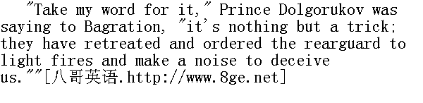 我来下命令。" "To-morrow, very likely, they will send me with some message to the Emperor," he thought. "Thank God!"" 明天很可能要派人带一项命令去觐见国王, "他想了想, "谢天谢地!" The shouts and lights in the enemy's army had been due to the fact that while Napoleon's proclamation had been read to the troops, the Emperor had himself ridden among the bivouacs. The soldiers on seeing the Emperor had lighted wisps of straw and run after him, shouting, "Vive l'Empereur!" Napoleon's proclamation was as follows:- 敌军中所以发出喊声, 燃起火把, 是因为他们向部队宣读拿破仑的圣旨, 这时皇帝正骑马亲自巡视自己的野营地。士兵们看见皇帝, 点燃一捆捆麦秆, 跟在皇帝后面奔走, 高呼: "皇帝万岁"。拿破仑的圣旨如下: "Soldiers! The Russian army is coming to meet you, to avenge the Austrian army, the army of Ulm. They are the forces you have defeated at Hollabrunn, and have been pursuing ever since up to this place. The position we occupy is a powerful one, and while they will march to out-flank me on the right, they will expose their flank to me! Soldiers! I will myself lead your battalions. I will keep out of fire, if you, with your habitual bravery, carry defeat and disorder into the ranks of the enemy. But if victory is for one moment doubtful, you will see your Emperor exposed to the enemy's hottest attack, for there can be no uncertainty of victory, especially on this day, when it is a question of the honour of the French infantry, on which rests the honour of our nation. Do not, on the pretext of removing the wounded, break the order of the ranks! Let every man be fully penetrated by the idea that we must subdue these minions of England, who are inspired by such hatred of our country. This victory will conclude our campaign, and we can return to winter quarters, where we shall be reinforced by fresh forces now being formed in France; and then the peace I shall conclude will be one worthy of my people, of you and me."NAPOLEON." 士兵们!俄国军队为奥军、乌尔姆军复仇, 现正攻击你们。这几个营队正是你们在霍拉布伦近郊打败, 并从那时起跟踪追逐到该地的军队。我们占领的阵地具有极大的威力, 故当他们向前推进, 妄图从右面包抄我军之际, 他们势必会向我军暴露其侧翼!士兵们!我亲自领导你们的营队。倘使你们怀有一般的勇敢精神, 就能在敌人的队伍中引起惊惶失措, 我则可远离火线;但若胜利即使有一瞬间令人担心, 你们就会看见你们的皇帝遭受到敌人的第一次打击, 因为胜利无可动摇, 尤当事关法国步兵的荣誉之日, 法国步兵则是为民族荣誉而战的一支必不可少的武装力量。不应在送走伤员的借口下使部队陷于瘫痪!每个人都要满怀这样一种观念: 务必打败这些极度仇恨我们民族的英国雇佣兵。这次胜利将结束我们的出征, 我们就能回到冬季驻扎地, 在此处遇见法国组建的新近到达的法国军队, 届时我所签订的和约将不辜负我的人民, 不辜负你们, 也不辜负我。