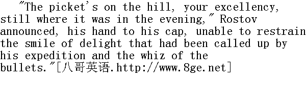 大人, 山上还有步哨, 他们一直待在夜晚盘踞的那个地方。"罗斯托夫禀告, 他向前弯下腰去, 举手敬礼, 禁不住流露出愉快的微笑。他这次骑行, 主要是子弹的呼啸声, 使他心中产生这种愉快的感觉。 "Very good, very good," said Bagration, "I thank you, monsieur l'officier."" 好, 好, "巴格拉季翁说, "军官先生, 谢谢您。" "Your excellency," said Rostov, "may I ask a favour?"" 大人, "罗斯托夫说, "有求于您。" "What is it?"" 怎么回事?" "To-morrow our squadron is ordered to the rear; may I beg you to attach me to the first squadron?"" 明天我们的骑兵连被派去充当后备队, 我求您把我暂时调到第一骑兵连。"