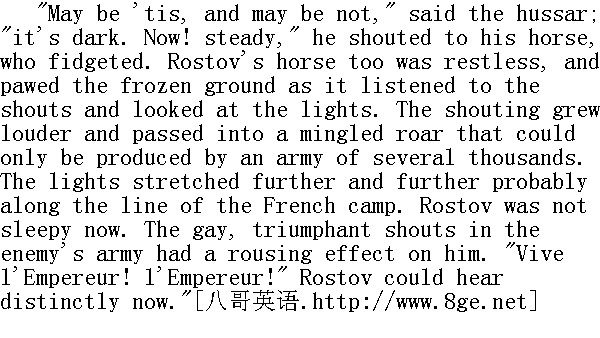 也许是敌人, 也许不是敌人, "骠骑兵说道, "晚上发生的事情。喂, 乱搞不行!"他对他骑的那匹微微骚动的马嚷道。罗斯托夫的马也性急起来了, 它用一只蹄子踢着冰冻的土地, 倾听着嘈杂的声音, 出神地望着火光。喊声越来越响亮, 汇成数千人的军队才能发出的轰鸣。火光蔓延的范围越来越大, 大概在法军营盘的全线扩展开来。罗斯托夫已经睡不着了。敌军得意洋洋的欢呼声使他感到激动不安。现在罗斯托夫已经清晰地听见"Vivel'empereur, l'empereur"!①的呼声。 ①法语: 皇帝万岁, 皇帝! "Not far off, beyond the stream it must be," he said to the hussar near him." 可是离这里不远, --大概在小河那边?"他对站在身边的骠骑兵说。 The hussar merely sighed without replying, and cleared his throat angrily. They heard the thud of a horse trotting along the line of hussars, and there suddenly sprang up out of the night mist, looking huge as an elephant, the figure of a sergeant of hussars. 骠骑兵只得叹口气, 什么都不回答, 愤怒地咳嗽几声清清嗓子。骠骑兵的全线都能听见疾速前进的骑士的马蹄声, 一名骠骑兵士官的身躯俨如一头巨象忽然从黑夜的雾霭中闪现出来了。 "Your honour, the generals!" said the sergeant, riding up to Rostov. Rostov, still looking away towards the lights and shouts, rode with the sergeant to meet several men galloping along the line. One was on a white horse. Prince Bagration with Prince Dolgorukov and his adjutant had ridden out to look at the strange demonstration of lights and shouts in the enemy's army. Rostov, going up to Bagration, reported what he had heard and seen to him, and joined the adjutants, listening to what the generals were saying." 阁下, 将军们到了!"骠骑兵士官走到罗斯托夫跟前时说道。罗斯托夫继续观看火光、静听呐喊声, 他随同这名士官前去迎接几位沿着散兵线奔驰而至的骑者。其中一位骑着白马。巴格拉季翁公爵、多尔戈鲁科夫公爵和几名副官出来观察敌军的火光和喊声这一奇特的现象。罗斯托夫走到巴格拉季翁跟前, 向他汇报了情况, 接着加入了副官的队列, 谛听将军们讲话。