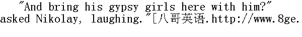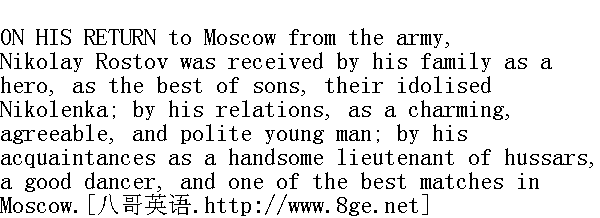 尼古拉·罗斯托夫从部队回到莫斯科以后, 家里人把他看作是一个最优秀的儿子、英雄和最心爱的尼古卢什卡;亲戚们把他看作是一个可爱的、招人喜欢的、孝敬的青年;熟人们把他看作是一个俊美的骠骑兵中尉、熟练的舞蹈家、莫斯科的最优秀的未婚夫之一。 All Moscow was acquainted with the Rostovs; the old count had plenty of money that year, because all his estates had been mortgaged, and so Nikolenka, who kept his own racehorse, and wore the most fashionable riding-breeches of a special cut, unlike any yet seen in Moscow, and the most fashionable boots, with extremely pointed toes, and little silver spurs, was able to pass his time very agreeably. After the first brief interval of adapting himself to the old conditions of life, Rostov felt very happy at being home again. He felt that he had grown up and become a man. His despair at failing in a Scripture examination, his borrowing money from Gavrilo for his sledge-drivers, his stolen kisses with Sonya-all that he looked back upon as childishness from which he was now immeasurably remote. Now he was a lieutenant of hussars with a silver-braided jacket, and a soldier's cross of St. George, he had a horse in training for a race, and kept company with well-known racing men, elderly and respected persons. He had struck up an acquaintance too, with a lady living in a boulevard, whom he used to visit in the evening. He led the mazurka at the Arharovs' balls, talked to Field-Marshal Kamensky about the war, and used familiar forms of address to a colonel of forty, to whom he had been introduced by Denisov. 莫斯科全市的人都是罗斯托夫之家的熟人, 今年老伯爵的进款足够开销了, 因为他的地产全部重新典当了, 所以尼古卢什卡买进了一匹个人享用的走马、一条最时髦的紧腿马裤, 这是一种在莫斯科还没有人穿过的式样特殊的马裤, 还添置一双最时髦的带有小银马刺的尖头皮靴, 他极为愉快地消度时光。罗斯托夫回家了, 在他为了适应旧的生活环境而度过一段时光后, 他已体验到那种非常惬意的感觉。他仿佛觉得, 他已经长大成人了。他因神学考试不及格而感到失望、向加夫里洛借钱偿还马车夫、和索尼娅偷偷地接吻, 他回想起这一切, 就像回想起时隔多年的久远的儿童时代的往事一般。现在他--一个骠骑兵中尉, 身披一件银丝镶边的披肩, 佩戴军人的乔治十字勋章, 和几个知名的备受尊敬的老猎手一起训练走马。在林荫路上, 他有个交往甚笃的女伴、夜晚他常到她家里去。他在阿尔哈罗夫家里举办的舞会上指挥马祖尔卡舞, 和卡缅斯基元帅谈及战事, 他常到英国俱乐部去, 与杰尼索夫给他介绍的那个四十岁的上校交朋友, 亲热地以"你"相称。 His passion for the Tsar flagged a little in Moscow, as he did not see him, and had no chance of seeing him all that time. But still he often used to talk about the Emperor and his love for him, always with a suggestion in his tone that he was not saying all that there was in his feeling for the Emperor, something that every one could not understand; and with his whole heart he shared the general feeling in Moscow of adoration for the Emperor Alexander Pavlovitch, who was spoken of at that time in Moscow by the designation of the "angel incarnate." 在莫斯科城, 他对国王的热烈的感情稍微减弱了, 因为他在这个期间没有看见他的缘故。不过他仍旧常常谈到国君, 谈到他对国君的爱戴, 他要大家感觉到, 他没有把话全部说完, 他对国王的热情中尚且存在某种不为尽人所能明了的东西;他由衷地随同当时的莫斯科公众共同体验他们对亚历山大·帕夫洛维奇皇帝的崇敬之情, 莫斯科当时把他称做"天使的化身"。 During this brief stay in Moscow, before his return to the army, Rostov did not come nearer to Sonya, but on the contrary drifted further away from her. She was very pretty and charming, and it was obvious that she was passionately in love with him. But he was at that stage of youth when there seems so much to do, that one has not time to pay attention to love, and a young man dreads being bound, and prizes his liberty, which he wants for so much else. When he thought about Sonya during this stay at Moscow, he said to himself: "Ah! there are many, many more like her to come, and there are many of them somewhere now, though I don't know them yet. There's plenty of time before me to think about love when I want to, but I have not the time now." Moreover, it seemed to him that feminine society was somewhat beneath his manly dignity. He went to balls, and into ladies' society with an affection of doing so against his will. Races, the English club, carousals with Denisov, and the nocturnal visits that followed-all that was different, all that was the correct thing for a dashing young hussar. 罗斯托夫在动身回部队以前, 在莫斯科的短暂逗留期间, 他没有和索尼娅接近, 相反地, 和她断绝往来了。她长得标致, 而且可爱, 很明显, 她已经爱上他了, 可是他处在风华正茂的年代, 看来还有许多事业要完成, 没有闲暇去干这种勾当, 年轻人害怕拘束, 但却珍惜那种从事多项事业所必需的自由。这次他在莫斯科逗留期间, 每当想到索尼娅, 他总要自言自语地说: "嗳, 像这样的姑娘可真多啊, 在某个地方还有许多我不熟悉的姑娘呢。只要我愿意, 我总来得及谈情说爱, 可是现在没有闲功夫了。"此外, 他出没于妇女交际场所, 有损于他的英勇气概。他装作违反意志的样子, 常去妇女交际场所参加舞会。而驾车赛马、英国俱乐部、与杰尼索夫纵酒、赴某地旅行--这倒是另一码事。而这对一个英姿勃勃的骠骑兵来说是很体面的。 At the beginning