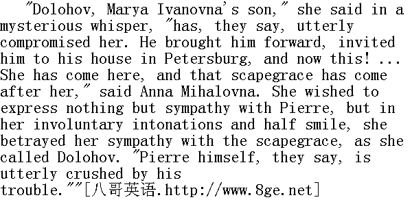 您告诉别祖霍夫, 要他到我这里来。我要把他的名字写在请帖上面。怎么, 他跟他老婆一道来吗?"他问道。 Anna Mihalovna turned up her eyes, and an expression of profound sadness came into her face. 安娜·米哈伊洛夫娜翻了翻白眼, 脸上露出了深深的悲痛。 "Ah, my dear, he's very unhappy," she said. "If it's true what we have been hearing, it's awful. How little did we think of this when we were rejoicing in happiness! and such a lofty, angelic nature, that young Bezuhov! Yes, I pity him from my soul, and will do my utmost to give him any consolation in my power."" 唉, 我的亲人, 他很不幸啊。"她说, "如果我们听到的是真情实况, 这就太骇人了。当我们为他的幸福而感到非常高兴的时候, 我们是否想到有这么一天!这样崇高的天使般纯洁的灵魂, 年轻的别祖霍夫啊!是的, 我由衷地替他惋惜, 我要尽可能地赐予他以安慰。" "Why, what is the matter?" inquired both the Rostovs, young and old together." 是怎么回事?"罗斯托夫父子二人--一老一少, 异口同声地问道。 Anna Mihalovna heaved a deep sigh. 安娜·米哈伊洛夫娜深深地叹一口气。