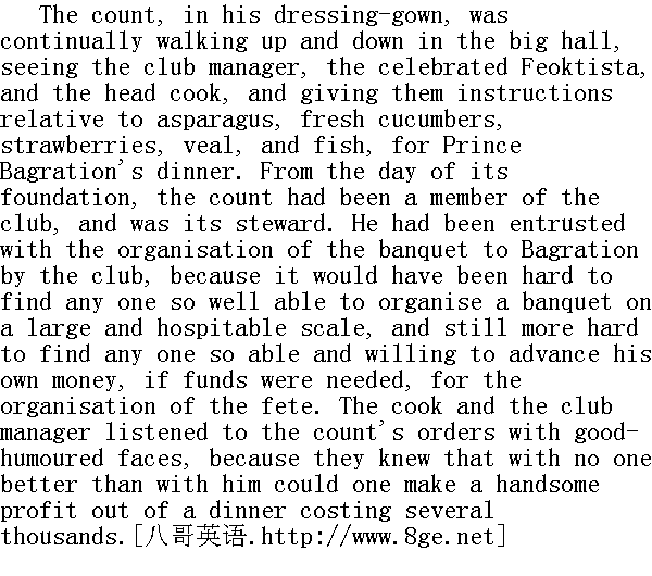 伯爵穿一种长罩衫在大厅中踱来踱去, 并且吩咐俱乐部的管事人和闻名的英国俱乐部的大厨师费奥克蒂斯特地为迎接巴格拉季翁公爵的宴会备办龙须菜、鲜黄瓜、草莓、小牛肉和鱼。自从俱乐部成立以来, 伯爵就是成员和主任。他接受俱乐部的委托, 为迎接巴格拉季翁筹办一次盛大的酒会, 因为很少有人这样慷慨待客, 他竟能举办豪华的宴会, 尤其是因为很少有人为举办华筵需要耗费金钱时能够而且愿意掏出腰包。俱乐部的厨师和管事人满面春风, 听候伯爵的吩咐, 因为他们知道, 在任何人手下都不如在他手下筹办一回耗费几千卢布的酒会中更加有利可图了。 "Well, then, mind there are scallops, scallops in pie-crust, you know."" 看着点, 甲鱼汤里放点儿鸡冠子, 鸡冠子, 你知道么?" "Cold entrees, I suppose-three? ..." questioned the cook." 这么说来, 要三个冷盘?......"厨师问道。 The count pondered. 伯爵沉思了片刻。 "Couldn't do with less, three ... mayonnaise, one," he said, crooking his finger." 要三个......不能少于三个, 一盘沙粒子油凉拌菜。"他屈着指头说道......