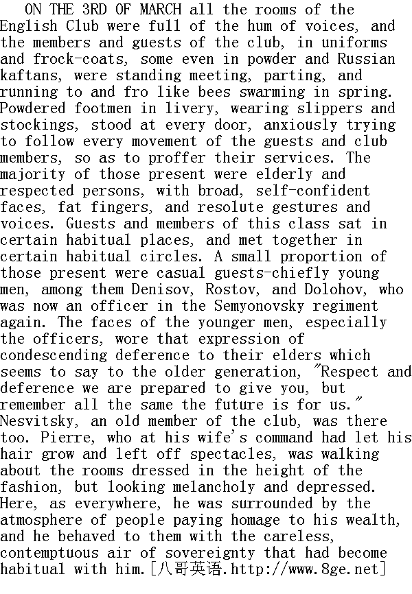 三月三日, 英国俱乐部的各个厅中都听见一片嘈杂声, 俱乐部的成员和客人们穿着制服、燕尾服, 有些人穿着束有腰带的长衫, 假发上扑了香粉, 就像一群在春季迁徙时节纷飞的蜜蜂似的往来穿梭, 一会儿坐着或站着, 一会儿集合或散开。假发上扑有香粉的仆人, 都穿着仆役制服、长袜和矮靿皮鞋, 伫立在每一道门旁, 很紧张地注意观察俱乐部的客人和成员的每个动作, 以便上前侍候。出席者之中多数是年高望重的人士, 他们都长着宽宽的充满自信的面孔、粗大的手指, 脚步稳健, 嗓音清晰。这一类来客和俱乐部的成员坐在他们习惯坐的某个位子上, 他们在惯常团聚的某些小组中碰头。出席者之中有一小部分是由偶然来的客人组合而成的--主要是年轻人, 其中包括杰尼索夫、罗斯托夫和多洛霍夫, 多洛霍夫又当上谢苗诺夫兵团的军官了。在青年人、特别是青年军人脸上都流露着轻视而又尊重老人的表情, 它仿佛在告诉老前辈: "我们愿意尊敬你们, 但是你们要记住, 未来毕竟是属于我们的。" 涅斯维茨基是俱乐部的老成员, 他也待在这个地方。皮埃尔遵照妻子的吩咐, 蓄一头长发, 摘下了眼镜, 穿着得合乎时尚, 但是他却流露着忧郁而沮丧的神色, 在几个大厅里踱来踱去。他在到处都是那个样子, 凡是崇拜他的财富的人都把他围住, 他于是摆出一副习以为常的作威作福的姿态, 带着漫不经心的蔑视的表情对待他们。 In years, he belonged to the younger generation, but by his wealth and connections he was a member of the older circles, and so he passed from one set to the other. The most distinguished of the elder members formed the centres of circles, which even strangers respectfully approached to listen to the words of well-known men. The larger groups were formed round Count Rostoptchin, Valuev, and Naryshkin. Rostoptchin was describing how the Russians had been trampled underfoot by the fleeing Austrians, and had had to force a way with the bayonet through the fugitives. Valuev was confidentially informing his circle that Uvarov had been sent from Petersburg to ascertain the state of opinion in Moscow in regard to Austerlitz. 论年龄, 他应该和年轻人在一起, 论个人财富和人情关系, 他却是年高望重的客人们的几个小组的成员, 因此他经常在这个小组和那个小组之间来来往往。最有威望的客人们中的老年人成为这几个小组的中心人物, 甚至陌生的客人也毕恭毕敬地与他们接近, 以便听取知名人士的发言。几个较大的小组安插在拉斯托普钦伯爵、瓦卢耶夫和纳雷什金的左近。拉斯托普钦谈到俄国官兵遭受逃跑的奥国官兵的践踏, 溃不成军, 不得不用刺刀穿过逃跑的人群给自己开辟一条道路。瓦卢耶夫机密地谈到, 乌瓦罗夫由彼得堡派来了解莫斯科人对奥斯特利茨战役的意见。 In the third group Naryshkin was repeating the tale of the meeting of the Austrian council of war, at which, in reply to the stupidity of the Austrian general, Suvorov crowed like a cock. Shinshin, who stood near, tried to make a joke, saying that Kutuzov, it seemed, had not even been able to learn from Suvorov that not very difficult art of crowing like a cock-but the elder club members looked sternly at the wit, giving him thereby to understand that even such a reference to Kutuzov was out of place on that day. 纳雷什金在第三组中谈到苏沃洛夫曾在奥国军委会会议中像公鸡似的发出尖叫声, 用以回答奥国将军们说的蠢话。这时分申申站在这里, 想开开玩笑, 他说, 看来库图佐夫没法学到苏沃洛夫这套简易的本领--像公鸡似的发出尖叫声;但是老人们严肃地看看这个爱戏谑的人, 让他感觉到今天在这儿谈论库图佐夫是不体面的。 Count Ilya Andreitch Rostov kept anxiously hurrying in his soft boots to and fro from the dining-room to the drawing-room, giving hasty greetings to important and unimportant persons, all of whom he knew, and all of whom he treated alike, on an equal footing. Now and then his eyes sought out the graceful, dashing figure of his young son, rested gleefully on him, and winked to him. Young Rostov was standing at the window with Dolohov, whose acquaintance he had lately made, and greatly prized. The old count went up to them, and shook hands with Dolohov. 伊利亚·安德烈伊奇·罗斯托夫伯爵忧虑不安, 他穿着一双软底皮靴仓促地从餐厅慢慢走进客厅, 又从客厅慢慢走回来, 神色慌张, 和他全都认识的达官显要、地位低微的人物一视同仁地打着招呼, 有时用目光搜寻身材匀称的英姿勃勃的儿子, 兴高采烈地把那目光停留在他身上, 向他使个眼色。年轻的罗斯托夫和多洛霍夫都站在窗口, 他在不久前结识了多洛霍夫并很珍视他们的交情。老伯爵走到他们面前, 握了握多洛霍夫的手。 "I beg you will come and see us; so you're a friend of my youngster's ... been together, playing the hero together out there.... Ah! Vassily Ignatitch ... a good day to you, old man," he turned to an old gentleman who had just come in, but before he had time to finish his greetings to him there was a general stir, and a footman running in with an alarmed countenance, announced: "He had arrived!"" 请光临, 你跟我的棒小子交上朋友了......你们在那儿并肩作战, 共同建立英雄功绩......啊!瓦西里·伊格纳季奇......, 老伙计, 您好, "他把脸转向从一旁走过的小老头, 说道, 但是他还来不及寒暄完毕, 周围的一切就动弹起来, 一个跑来的仆人面露惊恐的表情, 他面禀: "贵宾已光临!"