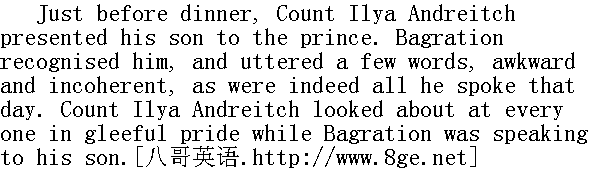 勇敢乃是胜利的保证, We have our Bagrations. 而我们拥有无数位巴格拉季翁, Our foes will all be at our feet," etc. etc. 一切敌人将在我们脚下跪倒。...... As soon as the singers had finished, more and more toasts followed, at which Count Ilya Andreitch became more and more moved, and more glass was broken and even more uproar was made. They drank to the health of Bekleshov, of Naryshkin, of Uvarov, of Dolgorukov, of Apraxin, of Valuev, to the health of the stewards, to the health of the committee, to the health of all the club members, to the health of all the guests of the club, and finally and separately to the health of the organiser of the banquet, Count Ilya Andreitch. At that toast the count took out his handkerchief and, hiding his face in it, fairly broke down. 歌手们刚刚吟唱完毕, 人们就接着一次又一次地举杯祝酒, 此时伊利亚·安德烈伊奇伯爵越来越受感动, 越来越多的酒樽被打碎了, 欢呼声也越来越响亮。人们为别克列绍夫、纳雷什金、乌瓦罗夫、多尔戈鲁科夫、阿普拉克辛、瓦卢耶夫的健康, 为理事们的健康、为管事人的健康, 为俱乐部全体成员的健康、为俱乐部的列位来宾的健康干杯, 末了, 单独为宴会筹办人伊利亚·安德烈伊奇伯爵的健康干杯。在举杯时, 伯爵取出手帕, 捂住脸, 放声大哭起来。