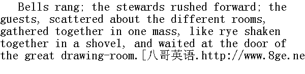 铃响了, 几个领导者冲上前来, 分布在各个房里的客人, 就像用木锹扬开的黑麦似的, 聚集成一堆, 在大客厅前的舞厅门旁停步了。 At the door of the ante-room appeared the figure of Bagration, without his hat or sword, which, in accordance with the club custom, he had left with the hall porter. He was not wearing an Astrachan cap, and had not a riding-whip over his shoulder, as Rostov had seen him on the night before the battle of Austerlitz, but wore a tight new uniform with Russian and foreign orders and the star of St. George on the left side of his chest. He had, obviously with a view to the banquet, just had his hair cut and his whiskers clipped, which changed his appearance for the worse. He had a sort of na?vely festive air, which, in conjunction with his determined, manly features, gave an expression positively rather comic to his face. Bekleshov and Fyodor Petrovitch Uvarov, who had come with him, stood still in the doorway trying to make him, as the guest of most importance, precede them. Bagration was embarrassed, and unwilling to avail himself of their courtesy; there was a hitch in the proceedings at the door, but finally Bagration did, after all, enter first. He walked shyly and awkwardly over the parquet of the reception-room, not knowing what to do with his hands. He would have been more at home and at his ease walking over a ploughed field under fire, as he had walked at the head of the Kursk regiment at Sch?ngraben. The stewards met him at the first door, and saying a few words of their pleasure at seeing such an honoured guest, they surrounded him without waiting for an answer, and, as it were, taking possession of him, led him off to the drawing-room. There was no possibility of getting in at the drawing-room door from the crowds of members and guests, who were crushing one another in their efforts to get a look over each other's shoulders at Bagration, as if he were some rare sort of beast. Count Ilya Andreitch laughed more vigorously than any one, and continually repeating, "Make way for him, my dear boy, make way, make way," shoved the crowd aside, led the guests into the drawing-room, and seated them on the sofa in the middle of it. The great men, and the more honoured members of the club, surrounded the newly arrived guests. Count Ilya Andreitch, shoving his way again through the crowd, went out of the drawing-room, and reappeared a minute later with another steward carrying a great silver dish, which he held out to Prince Bagration. On the dish lay a poem, composed and printed in the hero's honour. Bagration, on seeing the dish, looked about him in dismay, as though seeking assistance. But in all eyes he saw the expectation that he would submit. Feeling himself in their power, Bagration resolutely took the dish in both hands, and looked angrily and reproachfully at the count, who had brought it. Some one officiously took the dish from Bagration (or he would, it seemed, have held it so till nightfall, and have carried it with him to the table), and drew his attention to the poem. "Well, I'll read it then," Bagration seemed to say, and fixing his weary eyes on the paper, he began reading it with a serious and concentrated expression. The author of the verses took them, and began to read them aloud himself. Prince Bagration bowed his head and listened. 巴格拉季翁在接待室门口出现了, 他没有戴上军帽, 也没有佩带单刀, 按照俱乐部的惯例, 他把这些东西存放在阍者那里了。他没有戴羔皮军帽, 肩上也没有挎着马鞭, 有像罗斯托夫在奥斯特利茨战役前夜看见他时那个样子, 而是身穿一件紧身的新军服, 佩戴有俄国以及外国的各种勋章, 左胸前戴着圣乔治金星勋章。看来他在午宴之前剪了头发, 剃了连鬓胡子, 这使他的脸型变得难看了。他脸上流露着某种童稚而欢愉的表情, 加上他那刚勇而坚定的特征, 甚至于给人造成有几分滑稽可爱的印象。和他同路前来的别克列绍夫和费奥多尔·彼得罗维奇·乌瓦罗夫都在门口停步了, 想让他这位主要来宾在他们前面走。巴格拉季翁慌里慌张, 他不想心领他们的敬意, 停在门口, 最后巴格拉季翁还是走到前面去了。他在招待室的镶木地板上走着, 他感到腼腆, 不灵活, 真不知道把手放在何处才好。申格拉本战役中, 他在库尔斯克兵团前面, 置身于枪林弹雨之下, 沿着耕过的麦田行走时, 他心里反而觉得更习惯, 更轻快。几个领导骨干在第一道门口迎迓, 向他道出了几句欢迎贵宾的话, 不等他回答, 仿佛吸引了他的注意力, 把他围在中间, 领他进客厅。俱乐部的成员和客人把那客厅门口拉得水泄不通, 你推我撞, 力图超过他人的肩头把巴格拉季翁这头稀奇的野兽打量一番。伊利亚·安德烈伊奇伯爵精力至为充沛, 他含笑着说: "亲爱的, 让路, 让路, 让路!"推开一群人, 把客人们领进客厅, 请他们在中间的长沙发上入座。知名人士, 最受尊重的俱乐部的成员们, 又把来宾围在自己中间。伊利亚·安德烈伊奇伯爵又从人群中挤过去, 步出客厅, 俄而, 他又和另一名理事走来, 手里托着一只大银盘, 端到巴格拉季翁公爵面前。银盘中摆着一首为欢迎英雄而编印的诗。巴格拉季翁看了银盘, 便惊惶不安地东张西望, 仿佛在寻求援救似的。但是众人的眼神都要求他听从他们的意见。巴格拉季翁觉得自己已经遭受众人的控制, 他于是断然地将那银盘捧在手中, 他用气忿的责备的目光望了望端来银盘的伯爵。有个人怀有奉承的心情拿走巴格拉季翁手里的银盘(要不然, 他好像就要这样不停地端到晚上, 并且端着银盘上餐桌), 这个人请他注意那首诗。"喏, 让我来朗诵, "巴格拉季翁好像说了这句话, 他于是把那疲倦的目光集中