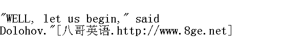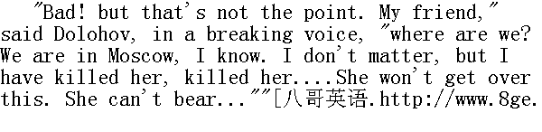 很糟!可是问题不在那里。我的朋友, "多洛霍夫用若断若续的嗓音说道。"我们在哪儿?我们在莫斯科, 我知道。我没有什么, 不过我把她害死了, 害死了......这一点她经受不了。她经受不了......" "Who?" asked Rostov." 是谁呢?"罗斯托夫问。 "My mother. My mother, my angel, my adored angel, my mother," and squeezing Rostov's hand, Dolohov burst into tears. When he was a little calmer, he explained to Rostov that he was living with his mother, that if his mother were to see him dying, she would not get over the shock. He besought Rostov to go to her and prepare her." 我的母亲。我的母亲, 我的天使, 我所崇拜的天使, 母亲。"多洛霍夫紧紧地握住罗斯托夫的手, 哭起来了。当他稍微安静后, 他对罗斯托夫详细说, 他和母亲住在一起, 如果母亲看见他死在旦夕, 她是受不了的。他恳求罗斯托夫到她那里去, 叫她思想上有所准备。 Rostov drove on ahead to carry out his wish, and to his immense astonishment he learned that Dolohov, this bully, this noted duellist Dolohov, lived at Moscow with his old mother and a hunchback sister, and was the tenderest son and brother. 罗斯托夫先一步去履行他所接受的委托, 使他大为惊讶的是, 他了解到多洛霍夫这个好惹事的人, 多洛霍夫这个决斗家在莫斯科和他的老母与那个佝偻的姐姐一同居住, 他是个非常和顺的儿子和弟弟。