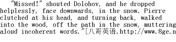 喂, 开始吧!"多洛霍夫说。 "To be sure," said Pierre, still with the same smile." 也好。"皮埃尔说, 仍然面露微笑。 A feeling of dread was in the air. It was obvious that the affair that had begun so lightly could not now be in any way turned back, that it was going forward of itself, independently of men's will, and must run its course. Denisov was the first to come forward to the barrier and pronounce the words: 那情景逐渐令人觉得可怕。很明显, 极为容易就着手做的事情, 已经无法加以遏止了, 它不以人们的意志为转移, 自然正在持续进行, 而且要干到底才好。杰尼索夫头一人走到界线面前, 他宣布: "Since the antagonists refuse all reconciliation, would it not be as well to begin? Take your pistols, and at the word 'three' begin to advance together. O ... one! Two! Three! ..." Denisov shouted angrily, and he walked away from the barrier. Both walked along the trodden tracks closer and closer together, beginning to recognise one another in the mist. The combatants had the right to fire when they chose as they approached the barrier. Dolohov walked slowly, not lifting his pistol, and looking intently with his clear, shining eyes into the face of his antagonist. His mouth wore, as always, the semblance of a smile." 因为敌手们拒绝调停, 所以就开始, 行不行, 拿起手枪, 听到喊'三'时, 就向决斗地点开始前进。""一!二!三!......"杰尼索夫恼怒地高呼, 之后他就走开了。二人都沿着踩出来的小路越走越近, 在那雾霭中渐渐地认清自己的敌手。两个敌手在走到决斗的界线前面的时候, 假如有一方愿意, 就有权开枪射击。多洛霍夫并没有举起手枪, 走得很慢, 他用那闪闪发亮的蓝眼睛盯着敌手的面孔。他的嘴角边一如平日带有近似微笑的表情。 "So when I like, I can fire," said Pierre, and at the word three, he walked with rapid steps forward, straying off the beaten track and stepping over the untrodden snow. Pierre held his pistol at full length in his right hand, obviously afraid of killing himself with that pistol. His left arm he studiously held behind him, because he felt inclined to use it to support his right arm, and he knew that was not allowed. After advancing six paces, and getting off the track into the snow, Pierre looked about under his feet, glancing rapidly again at Dolohov, and stretching out his finger, as he had been shown, fired. Not at all expecting so loud a report, Pierre started at his own shot, then smiled at his own sensation and stood still. The smoke, which was made thicker by the fog, hindered him from seeing for the first moment; but the other shot that he was expecting did not follow. All that could be heard were Dolohov's rapid footsteps, and his figure came into view through the smoke. With one hand he was clutching at his left side, the other was clenched on the lower pistol. His face was pale. Rostov was running up and saying something to him. 皮埃尔听见喊"三"时, 就迈开脚步, 飞快地往前走去, 他离开踩出的小径, 沿着没有人走过的雪地大踏步前进。皮埃尔握着手枪, 向前伸出自己的右手, 显然他害怕他会用这支手枪打死他自己。他极力地把左手向后伸出一些, 因为他想用它来托住右手, 同时他也晓得这样做是不行的。皮埃尔大约走了六步路, 就离开小径, 向那雪地里走去。皮埃尔望望脚下, 又飞快地瞟了多洛霍夫一眼, 便像人家教他那样用指头勾了一下扳机, 开了一枪。皮埃尔无论怎样都不会料到枪声竟有这么响亮, 他听见自己的枪声时哆嗦了一下, 这之后便对自己的这一印象微微一笑, 他停住了。在雾气中, 硝烟分外浓, 起初一刹那妨碍他看东西, 但是他所等待的另一声回击, 并没有继之而至。仅仅听见多洛霍夫的急促的脚步声, 他的身形从烟雾中显露出来。他用一只手按着左边的肋部, 用另一只手紧紧地握着垂下的手枪。他脸色惨白。罗斯托夫向他跟前跑去, 对他道出一句话。