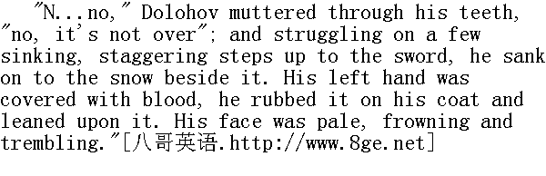 不......"多洛霍夫透过牙缝说, "不, 还没有完, "他跌跌撞撞, 一瘸一拐地走了几步, 走到一柄马刀前面, 就倒在马刀旁边的雪地上。他的左手沾满了鲜血, 他在常礼服上揩了揩手, 用那只手支撑着身体。他脸色惨白, 蹙着额角, 不住地颤栗。 "Co..." Dolohov began, but he could not at once articulate the words: "come up," he said, with an effort. Pierre, hardly able to restrain his sobs, ran towards Dolohov, and would have crossed the space that separated the barriers, when Dolohov cried: "To the barrier!" and Pierre, grasping what was wanted, stood still just at the sword. Only ten paces divided them. Dolohov putting his head down, greedily bit at the snow, lifted his head again, sat up, tried to get on his legs and sat down, trying to find a secure centre of gravity. He took a mouthful of the cold snow, and sucked it; his lips quivered, but still he smiled; his eyes glittered with the strain and exasperation of the struggle with his failing forces. He raised the pistol and began taking aim." 请......"多洛霍夫开了腔, 但是不能一下子把话说出来......"请吧, "他费劲地说完了这句话。皮埃尔好容易才忍住, 没有大哭起来, 他向多洛霍夫面前跑去, 已经要越过界线之间的空地了, 多洛霍夫喊了一声: "回到决斗时设定双方距离的界线上去!"皮埃尔明了是怎么回事, 就在自己的马刀旁边停步了......他们之间的间隔只有十步路之遥。多洛霍夫低下头, 靠在雪地上, 贪婪地吃了几口雪, 又抬起头来, 抖擞一下精神, 蜷曲起两腿, 寻找稳定的身体重心, 坐了起来。他大口大口地吞咽冰冷的雪, 吸吮雪水, 他的嘴唇不住的颤栗, 但仍旧面露微笑, 他鼓足最后的力气, 眼睛里闪烁出拼搏和凶恶的光泽。他举起手枪, 开始瞄准了。 "Sideways, don't expose yourself to the pistol," said Nesvitsky." 侧着身子, 用手枪挡住身体。"涅斯维茨基说道。 "Don't face it!" Denisov could not help shouting, though it was to an antagonist." 您挡住吧, "甚至连杰尼索夫也忍耐不住了, 他向自己的敌手喊了一声。 With his gentle smile of sympathy and remorse, Pierre stood with his legs and arms straddling helplessly, and his broad chest directly facing Dolohov, and looked at him mournfully. Denisov, Rostov, and Nesvitsky screwed up their eyes. At the same instant they heard a shot and Dolohov's wrathful cry. 皮埃尔面露遗憾、后悔和温顺的微笑, 束手无策地叉开两腿, 张开两臂, 挺起宽阔的胸膛, 笔直地站在多洛霍夫面前, 忧郁地望着他。杰尼索夫、罗斯托夫和涅斯维茨基眯缝起眼睛。与此同时, 他们听见了枪声和多洛霍夫的凶恶的喊声。