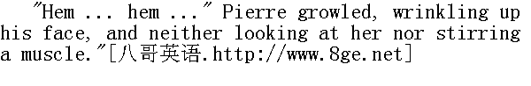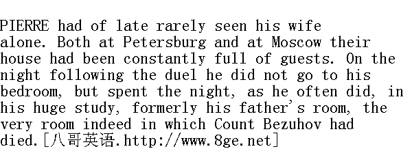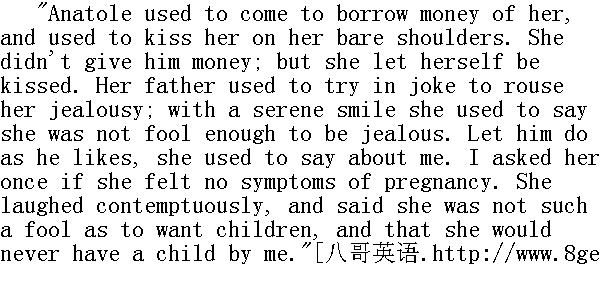 阿纳托利常常到她那里去, 向她借钱, 吻她裸露的肩头。她不把钱借给他, 但却允许他去吻她。父亲的戏谑引起她的醋意, 她含着宁静的微笑说道, 她不会那么愚蠢, 以致于吃醋, 她谈论我的时候这么说: 他愿意干什么, 就让他干什么。有一回我问她, 她是否感到她有怀孕的征状。她轻蔑地大笑, 并且说她不会那么愚蠢, 以致于希冀生儿育女, 她不会为我生几个孩子的。 Then he thought of the coarseness, the bluntness of her ideas, and the vulgarity of the expressions that were characteristic of her, although she had been brought up in the highest aristocratic circles. "Not quite such a fool...you just try it on...you clear out of this," she would say. Often, watching the favourable impression she made on young and old, on men and women, Pierre could not understand why it was he did not love her. "Yes; I never loved her," Pierre said to himself; "I knew she was a dissolute woman," he repeated to himself; "but I did not dare own it to myself. 后来他回想起, 虽然她在上层贵族社会中受过教育, 但是她的思想却很粗陋而且简单, 她所惯用的言词庸俗而不可耐。"我不是一个微贱的傻瓜......不信的话, 试试看......allez vous promen-er。"①她说。皮埃尔常常看见她在男女老少心目中取得的成就, 但是他无法明白他为什么不爱她。"可是我从来没有爱过她, "皮埃尔对自己说, "我知道她是一个淫荡的女人, "他重复地说, 可是这一点他不敢承认。 ①法语: 滚开。 "And now Dolohov: there he sits in the snow and forces himself to smile; and dies with maybe some swaggering affectation on his lips in answer to my remorse."" 你看, 多洛霍夫正坐在雪地上, 强颜微笑, 他行将死去, 大概还装作逞英雄的样子, 想用以回答我的忏悔!" Pierre was one of those people who in spite of external weakness of character-so-called-do not seek a confidant for their sorrows. He worked through his trouble alone. 从外表看来, 有些人的性格可以说是很软弱, 但是他们却不寻找别人来分担自己的痛苦, 皮埃尔就是他们之中的一人。他独自一人体会自己的痛苦。
