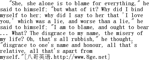她在各个方面, 在各个方面都是有过错的, "他自言自语地说, "那末, 要怎么样呢?我为什么把我自己和她结合在一起呢?我为什么对她说出这句话: 'Je vous aime'②, 这是句谎话, 甚至比谎话更坏, "他自言自语地说, "我有过错, 应当来承担......甚么?声名狼藉吗?生活不幸吗?唉, 这全是废话, "他想了想, "无论是玷辱名声, 抑或是享有殊荣, 全是相对而论, 一切都不以我为转移。" ②法语: 我爱您。 "Louis XVI was executed because they said he was dishonourable and a criminal" (the idea crossed Pierre's mind), "and they were right from their point of view just as those were right too who died a martyr's death for his sake, and canonised him as a saint. Then Robespierre was executed for being a tyrant. Who is right, who is wrong? No one. But live while you live, to-morrow you die, as I might have died an hour ago. And is it worth worrying oneself, when life is only one second in comparison with eternity?" But at the moment when he believed himself soothed by reflections of that sort, he suddenly had a vision of her, and of her at those moments when he had most violently expressed his most insincere love to her, and he felt a rush of blood to his heart, and had to jump up again, and move about and break and tear to pieces anything that his hands came across. "Why did I say to her 'I love you'?" he kept repeating to himself. And as he repeated the question for the tenth time the saying of Moliere came into his head: "But what the devil was he doing in that galley?" and he laughed at himself." 路易十六被处以死刑, 是因为他们说他寡廉鲜耻, 罪恶累累(皮埃尔忽然想起这件事), 他们从自己的观点看来是对的, 正如那些为他而折磨致死, 将他奉为神圣的人, 也是对的。后来罗伯斯庇尔因是暴君而被处以极刑。谁无辜, 谁有罪?莫衷一是。你活着, 就活下去: 说不定你明天就死去, 正如一小时前我也可能死去一样。人生与永恒相比较只是一瞬间, 值得遭受折磨吗?"但是在他认为这种论断使他自己得到安慰的时候, 她忽然在他脑海中浮现出来, 在他至为强烈地向她表白虚伪的爱情时, 他感觉到一股热血涌上心头, 又不得不站立起来, 举步向前, 他在手边随便碰到什么东西, 就把它折断、撕破。"我为什么对她说: '我爱您?'"他还在自言自语地重复这句话。这个问题重提了十次, 他忽然想到莫里哀的台词: "Mais que diable allait-il faire dans cette qalere?"①他于是嘲笑自己来了。 In the night he called for his valet and bade him pack up to go to Petersburg. He could not conceive how he was going to speak to her now. He resolved that next day he would go away, leaving her a letter, in which he would announce his intention of parting from her for ever. 晚上他把侍仆喊来, 吩咐他准备行装, 到彼得堡去。他不能跟她住在同一栋屋里了。他不能想象他现在应该怎样和她谈话。他决定明天启程, 给她留下一封信, 他在信中把他要跟她永远分离的打算告诉她了。 In the morning when the valet came into the study with his coffee, Pierre was lying on an ottoman asleep with an open book in his hand. 清晨当侍仆端着咖啡走进书斋的时候, 皮埃尔躺在土耳其式沙发上, 手中拿着一本打开的书睡着了。
