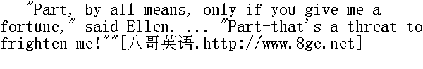 哼......哼, "皮埃尔皱着眉头, 不去看她, 四肢丝毫也不动弹, 含糊不清地说话。 "And how came you to believe that he's my lover? ... Eh? Because I like his society? If you were cleverer and more agreeable, I should prefer yours."" 您为什么竟会相信他是我的情夫呢?......为什么?因为我喜欢和他交往吗?如果您会更聪明, 更可爱, 我就宁愿和您在一起。" "Don't speak to me ... I beseech you," Pierre muttered huskily." 甭跟我说吧......我恳求您。"皮埃尔嘶哑地轻声说。 "Why shouldn't I speak? I can speak as I like, and I tell you boldly that it's not many a wife who with a husband like you wouldn't have taken a lover, but I haven't done it," she said. Pierre tried to say something, glanced at her with strange eyes, whose meaning she did not comprehend, and lay down again. He was in physical agony at that moment; he felt a weight on his chest so that he could not breathe. He knew that he must do something to put an end to this agony but what he wanted to do was too horrible." 我为什么不说话呢?我可以说话, 而且要大胆地说话, 凡是有您这样的丈夫的妻子, 很少有人不找到几个情夫的(法语为: des amants), 可是我没有干这种勾当。"她说道。皮埃尔想说句什么话, 他用她无法理解的奇异的眼神望望她, 又躺下来。这时候他在肉体上遭受痛苦, 他觉得胸口发闷, 几乎不能呼吸。他知道他应当拿出一点办法来制止肉体上的痛苦, 但是他想做的事情太骇人了。 "We had better part," he articulated huskily." 我们最好分手吧。"他若断若续地说。