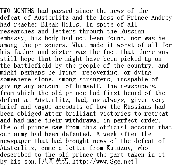 自从童山接获有关奥斯特利茨战役以及安德烈公爵捐躯的消息之后已经两个月了, 虽然经由大使馆致函询问并竭尽全力侦查, 但是公爵的尸体未能找到, 在俘虏之中也没有他的踪影。使他的亲属感到至为难受的是, 他们仍旧抱有一线希望, 认为当地居民把他从战场上抬走, 现在地也许置身于陌生人之中, 独自一人躺在什么地方, 身体日渐康复, 或则行将死去, 没法将他自己的消息传递出去。老公爵首次从报纸上得悉奥斯特利茨战败的消息, 但是报纸上照常报道得非常简短而且很不明确, 报纸上说俄国官兵在几次辉煌战役后不得不撤退, 他们撤退时遵守严格的秩序。从这则官方消息上老公爵获悉我军已被粉碎了。在报上登载奥斯特利茨战役的消息后过了一个礼拜, 库图佐夫寄来一封信, 他在信中告知公爵有关他儿子的遭遇。 "Before my eyes," wrote Kutuzov, "your son with the flag in his hands, at the head of a regiment, fell like a hero, worthy of his father and his fatherland. To my regret and the general regret of the whole army it has not been ascertained up to now whether he is alive or dead. I comfort myself and you with the hope that your son is living, as, otherwise, he would have been mentioned among the officers found on the field of battle, a list of whom has been given me under flag of truce."" 我亲眼看见令郎, "库图佐夫写道, "手中擎着一面军旗在兵团前面倒下了, 他不愧为他父亲和祖国的英雄。令我和全军感到遗憾的是, 直至现在依旧不知道, 他是活着, 还是牺牲了, 否则, 在由军使递交给我的战地伤亡军官名单中, 必定会列入他的姓名。"夜晚老公爵接到了这个消息, 是时他独自一人呆在书斋里。第二天清晨, 他一如平时又外出散步, 而他在管事、园丁和建筑师当中默不作声, 虽然他怒形于色, 但他未对任何人道出一句话来。 After receiving this letter, late in the evening when he was alone in his study, the old prince went for this morning walk as usual next day. But he was silent with the bailiff, the gardener, and the architect, and though he looked wrathful, said nothing to them. When Princess Marya went in to him at the usual hour, he was standing at the lathe and went on turning as usual, without looking round at her. "Ah? Princess Marya!" he said suddenly in an unnatural voice, and he let the lathe go. (The wheel swung round from the impetus. Long after, Princess Marya remembered the dying creak of the wheel, which was associated for her with what followed.) 在平时规定的时刻, 叫做玛丽亚的公爵小姐走进屋里来看他, 他正在车床旁边站着, 做镟工活儿, 他像平常一样没有掉过头来望望她。"啊!公爵小姐玛丽亚!"他突然不自然地说道, 扔下了凿子。车床的轮子由于冲力的关系仍在转动着, 公爵小姐玛丽亚长久地记得逐渐停息的轮子的吱吱声, 和接踵而至的事情在她心目中融合起来了。 Princess Marya went up to him; she caught sight of his face, and something seemed suddenly to give way within her. Her eyes could not see clearly. From her father's face-not sad nor crushed, but vindictive and full of unnatural conflict-she saw that there was hanging over her, coming to crush her, a terrible calamity, the worst in life, a calamity she had not known till then, a calamity irrevocable, irremediable, the death of one beloved. 公爵小姐玛丽亚移动脚步, 走到他跟前, 一望见他的脸色, 她身上便像有件什么东西忽然沉下去了。她的两眼看不清楚了。父亲的面色既不忧愁, 也不沮丧, 而是凶神恶煞, 很不自然, 她从父亲的面色看出, 一种可怕的不幸, 她从未经历的生活中的莫大的不幸, 无可挽救的毋容思议的不幸威胁着她, 使她精神上感到压抑, 而这种不幸指的是亲人的寿终正寝。 "Father! Andrey? ..." said the ungainly, awkward princess with such unutterable beauty of sorrow and self-forgetfulness that her father could not bear to meet her eyes and turned away sobbing.