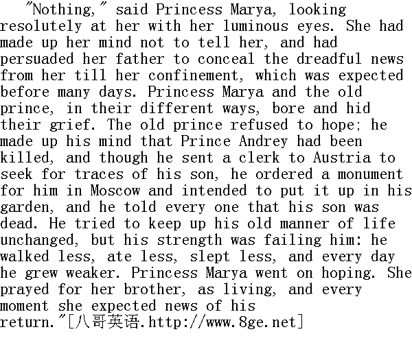 pere, "她说道, "不要离开我吧, 让我俩在一块儿痛哭吧。" "Blackguards, scoundrels!" screamed the old man, turning his face away from her. "Destroying the army, destroying men! What for? Go, go and tell Liza."" 这些坏蛋, 卑鄙的家伙!"老头儿喊道, 把脸移开, 躲避她。"葬送了军队, 葬送了人们!为了什么?你去, 你去, 去告诉丽莎。" Princess Marya sank helplessly into an armchair beside her father and burst into tears. She could see her brother now at the moment when he parted from her and from Liza with his tender and at the same time haughty expression. She saw him at the moment when tenderly and ironically he had put the image on. "Did he believe now? Had he repented of his unbelief? Was he there now? There in the realm of eternal peace and blessedness?" she wondered. "Father, tell me how it was," she asked through her tears. 公爵小姐软弱无力地坐到父亲旁边的安乐椅上嚎啕大哭起来。现在她好像看见哥哥带着他那温和而傲慢的神态跟她和丽莎告别。她好像看见他温和地、讥讽地给自己戴上小神像。"他是否信教呢?他是否对他不信教而感到后悔呢?他现在是否在那里?是否在那永恒的静谧与极乐的天宫?"她想道。"Mon pere, 请您把这件事的经过告诉我吧。"她眼泪汪汪地问道。 "Go away, go,-killed in a defeat into which they led the best men of Russia and the glory of Russia to ruin. Go away, Princess Marya. Go and tell Liza. I will come." When Princess Marya went back from her father, the little princess was sitting at her work, and she looked up with that special inward look of happy calm that is peculiar to women with child. It was clear that her eyes were not seeing Princess Marya, but looking deep within herself, at some happy mystery that was being accomplished within her." 你去吧, 你去吧, 他在战斗中给打死了, 在那场战斗中打死了许多优秀的俄国人, 玷污了俄国的荣誉。公爵小姐玛丽亚, 您去吧。去告诉丽莎。我马上就来。"当公爵小姐从父亲那里回来的时候, 矮小的公爵夫人正坐着做针线活儿, 她用那只有孕妇们才特具的内心平静与幸福的眼神望了望公爵小姐玛丽亚。很明显, 她的眼睛没有望见公爵小姐玛丽亚, 而是向自己体内望去, 向她腹内的幸福而神秘的东西望去。 "Marie," she said, moving away from the embroidery frame and leaning back, "give me your hand." She took her sister-in-law's hand and laid it below her waist. Her eyes smiled, expectant, her little dewy lip was lifted and stayed so in childlike rapture. Princess Marya knelt down before her, and hid her face in the folds of her sister-in-law's dress. "There-there-do you feel it? I feel so strange. And do you know, Marie, I am going to love him very much," said Liza, looking at her sister-in-law with shining, happy eyes. Princess Marya could not lift her head; she was crying." 玛丽(玛丽亚的法语称谓), "她说道, 从绣花架子移开身子, 向后靠着, "把你的手向我伸出来。"她一把抓住公爵小姐的手, 把它放在自己的肚子上。她的一对眼睛微露笑意, 等待着她那长满茸毛的嘴唇翘起来, 像那幸运的儿童不停地翘着嘴唇似的。公爵小姐玛丽亚跪在她面前, 把脸蛋藏在嫂嫂的连衣裙的皱襞里。"诺, 诺, 你听见吗?我觉得非常奇怪。玛丽, 你要晓得, 我是很爱他的, "丽莎说, 她用那闪闪发光的幸福的眼睛望着小姑子。公爵小姐玛丽亚没法抬起头来, 她哭泣着。