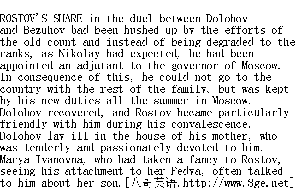 罗斯托夫参与多洛霍夫和别祖霍夫决斗的事件, 因为老伯爵尽了最大的努力, 总算了结了。不像罗斯托夫预料的那样, 他非但未被降级, 反而被派至莫斯科总督名下当副官。因此他未能偕同全家人到农村里去, 整个夏天只得留在莫斯科履行新职务。多洛霍夫的伤已经养好了, 在他逐渐康复的时候, 罗斯托夫和他特别要好。多洛霍夫在那个深情地、体贴入微地疼爱他的母亲身边卧床养伤。老太太玛丽亚·伊万诺夫娜鉴于罗斯托夫和费佳(费奥多尔的小名)要好, 很喜欢罗斯托夫, 她常常对他谈到儿子的事情。 "Yes, count, he is too noble, too pure-hearted," she would say, "for the corrupt society of our day. Virtue is in favour with no one; it is apt to be a reproach to everybody. Come, tell me, count, was it right, was it honourable on Bezuhov's part? Fedya in his noble-hearted way loved him, and even now he never says a word against him. In Petersburg those pranks with the police constables, those practical jokes they played there, didn't they do everything together? And Bezuhov got nothing for it, while Fedya took all the blame on his shoulders. What he has had to go through! He has been reinstated, I know, but how could they help reinstating him? I don't suppose there were many such gallant, true sons of their fatherland out there! And now, what?-this duel! Is there any feeling, any honour left in men? Knowing he was the only son, to call him out and aim so straight at him! We may be thankful God has been merciful to us. And what was it all for? Why, who hasn't intrigues nowadays? Why, if he were so jealous-I can understand it-he ought to have let it be seen long before, you know, and it had been going on for a year. And then to call him out, reckoning on Fedya's not fighting him because he was indebted to him. What baseness! What vileness! I know you understand Fedya, my dear count, and that's why I love you, believe me, from my heart. Few do understand him. His is such a lofty, heavenly nature!"" 是啊, 伯爵, 对我们现在这个淫乱的世界来说, 他的心灵太高尚、太纯洁了。"她说道, 高尚的品德, 谁也不喜欢, 它会刺伤大家的眼睛。啊, 伯爵, 请您说说, 别祖霍夫的行为对吗?正当吗?费佳的品质高尚, 很喜爱他, 从来都不会说他一句坏话。有人在彼得堡跟警察分局长胡闹, 乱开心, 岂不是他们一伙干的么?那又怎样呢, 别祖霍夫无所谓, 费佳却承担全部责任!要知道, 他一人承担全部罪责啊!就算是恢复了原职吧, 怎能不恢复原职呢?我以为像他这样的祖国的勇士和男儿, 还不太多呢。现在干嘛要决斗?这些人是否有情感, 是否有人格!分明知道他是个独生子, 硬要挑起决斗, 正好把他击中了!好在老天爷饶恕了我们。究竟是为什么呢?嘿, 我们这个时代, 谁不搞阴谋诡计啊?即使他的醋意很浓, 也没有什么?我明白, 先前他就得通通气, 谁知道竟然拖上一年了。他要求决斗, 也没有什么, 却自以为费佳不会来吵架, 因为他欠他的债。多么卑鄙啊!多么龌龊啊!我知道您了解费佳, 亲爱的伯爵, 所以我由衷地疼爱您, 您相信我吧。很少有人了解他。这是个多么高尚的、纯洁的灵魂。" Dolohov himself, during his convalescence, often said to Rostov things which could never have been expected from him. 在多洛霍夫逐渐康复时, 他本人时常对罗斯托夫说些他决没法料到他会说的话。 "People think me a wicked man, I know," he would say; "and they're welcome to think so. I don't care to know any one except those whom I love. But those I do love, I love in such a way that I would give my life for them, and all the rest I will crush if they get in my way. I have a precious and adored mother, and two or three friends, you among them; and as to the rest, I only pay attention to them in so far as they are useful or mischievous. And almost all are mischievous, especially the women. Yes, my dear," he went on, "men I have met who were loving, noble, and lofty-minded. But women that were not cattle for sale-countesses and cooks, they're all alike-I have not come across yet. I have not yet met the angelic purity and devotion which I look for in woman. If I could find such a woman, I would give my life for her! But these creatures!..." He made a gesture of contempt. "But believe me, if I still care for life, I care for it because I still hope to meet such a heavenly creature, who would regenerate and purify and elevate me. But you don't understand that."" 人家把我看成是凶恶的人, 我是知道的, "他说, "就让他们自以为是吧。除开我所爱的人而外, 我不愿意知道任何人, 但是我爱着什么人, 就会强烈地爱, 以致于献出我的生命, 而所有其他人只要拦住我的去路, 我就会压死他们。我有个我所崇拜的、非常可贵的母亲、两三个朋友, 其中包括你, 而对其他人, 只看他们对我有益或有害的程度而定。所有的人, 特别是妇女, 几乎都是对我有害的。是啊, 我的心肝, "他继续说, "我碰到一些令人可爱的、光明正大的、崇高的男人, 但是除开卖身的娼妓--无论是伯爵夫人, 抑或是厨娘(横竖都一样)--我还没有遇见别的妇女。我还没有遇见我在妇女身上探寻的那种圣洁和忠诚的品质。假使我能够找到一个这样的女人, 我愿意为她献出自己的生命。而这些女人!......"他做出轻蔑的手势。"你是否相信我, 只要我还珍惜我的生命, 那末我之所以珍惜它, 只是因为我还希望遇见一个这样圣洁的生灵, 她会使我变得光明正大、纯洁而高尚, 使我重新振奋起来。可是你不明白这一点。" "Yes, I quite understand," answered Rostov, who was very much under the influence of his new friend." 不, 我十分明白。"罗斯托夫受到他