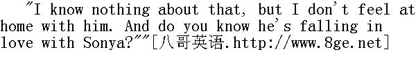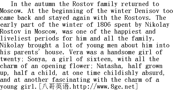 秋天, 罗斯托夫一家人回到莫斯科。冬季之初杰尼索夫也回来了, 他暂时住在罗斯托夫家中。这是尼古拉·罗斯托夫在莫斯科消度的一八○六年的初冬, 这对他和全家人来说都是最幸福的、最愉快的。尼古拉把许多年轻人领到父母的住所。薇拉是一个二十岁的美丽的少女;索尼娅是个十六岁的姑娘, 像一朵刚刚绽开的娇艳的鲜花。娜塔莎既是半个小姐, 又是半个小姑娘, 她时而像那儿童似的令人好笑, 时而像那少女似的富有魅力。 The Rostovs' house was at that time full of a sort of peculiar atmosphere of love-making, as commonly happens in a household where there are very young and very charming girls. Among those young girls' faces, impressionable and always smiling (probably at their own happiness), in that whirl of eager bustle, amid that young feminine chatter, so inconsequent, but so friendly to every one, so ready for anything, so full of hope, and the inconsequent sound of singing and of music, any young man who came into the house felt the same sensation of readiness to fall in love and longing for happiness, that the younger members of the Rostov household were feeling themselves. 这时候在罗斯托夫家中形成了一种特别亲热的气氛, 正如那拥有很可爱和很年轻的姑娘的家中常有的气氛一样。前来罗斯托夫家的每个年轻人都望着这些年轻的十分敏感的不知为什么(也许是为自己的幸福)而露出笑容的少女的面孔, 望着欢腾的奔忙, 听着青年妇女的这些前后不相连贯的, 但是大家听来, 觉得亲热的, 对一切乐于效劳而且满怀希望的窃窃私语, 时而听见若断若续的歌声, 时而听见若断若续的乐声, 都体会到同样的情欲和对幸福期待的感觉, 而这也正是罗斯托夫家里的年轻人自己体会到的感觉。 Among the young men Rostov brought to the house, one of the foremost was Dolohov, who was liked by every one in the house except Natasha. She almost had a quarrel with her brother over Dolohov. She persisted that he was a spiteful man; that in the duel with Bezuhov, Pierre had been in the right and Dolohov in the wrong, and that he was horrid and not natural. 罗斯托夫领进家里来的年轻人之中头一批里头有个多洛霍夫, 家里所有的人都喜欢他, 只有娜塔莎不在其列。为了多洛霍夫的事情, 她几乎要和哥哥争吵起来。她固执己见, 认为他是个凶恶的人, 至于他和别祖霍夫决斗一事, 皮埃尔是对的, 多洛霍夫有过错, 认为他令人厌恶, 装腔作势。 "I know nothing about it, indeed," Natasha would cry with self-willed obstinacy; "he's spiteful and heartless. Your Denisov now, you see, I like; he's a rake, and all that, but still I like him, so I do understand. I don't know how to tell you; with him everything is done on a plan, and I don't like that. Denisov, now..."" 我没有什么可了解的!"娜塔莎倔强而任性地喊道, "他是个凶狠的、没有感情的人。我倒喜欢你的杰尼索夫, 他是个酒鬼, 样样都来一手, 不过我还是爱他, 因此他的情况我是了解的。怎么对你说呢, 我不在行, 而他的一言一行却抱有特殊目的, 这一点我不喜欢。杰尼索夫......" "Oh, Denisov's another matter," answered Nikolay, in a tone that implied that in comparison with Dolohov even Denisov was not of much account. "One must understand what soul there is in that Dolohov; one must see him with his mother; such a noble heart!"" 喏, 杰尼索夫是另一回事, "尼古拉一边回答, 一边要让人家感觉到, 与多洛霍夫比较时, 甚至连杰尼索夫也是微不足道的, "应当了解, 这个多洛霍夫的灵魂是多么纯洁, 应当看见他是怎样对待母亲的, 这才是善良的心肠啊!"