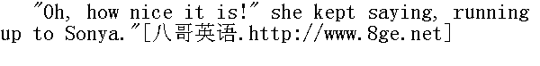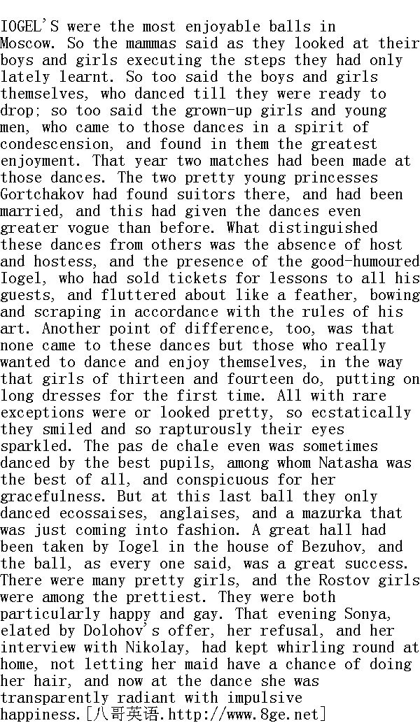 约格尔家里举办的舞会是莫斯科的最快乐的舞会。娘儿们看见自己的adolescentes①跳着刚刚学会的舞步时都这么说;跳舞跳得累倒的男女少年也都这么说;已经长大的少女和青年同样说出这句话, 他们怀有屈尊俯就的心绪前来出席舞会, 从中寻求令人消魂的乐趣。是年, 舞会上办成了两件婚事。戈尔恰科夫家的两个俊美的公爵小姐觅得未婚夫, 并已出嫁, 这个舞会因而享有盛誉。男女主人均不在场, 乃是舞会的特点: 善良心肠的约格尔就像飞扬的羽毛, 飘飘然, 十分内行地并脚致礼, 他向所有的客人收取授课的酬金。而且只有想要跳舞和寻欢作乐的人才来出席舞会, 就像十三四岁的小姑娘头一回穿上长长的连衣裙也有这样的兴头似的, 此其二。除了少数几个人例外, 个个都漂漂亮亮, 或者看起来漂漂亮亮, 他们都兴高采烈地微笑, 两眼闪烁着明亮的光辉。优秀的女生有时候甚至跳着pas de chaBle①, 在这里, 婀娜多姿的娜塔莎出类拔萃;在这最后一次舞会上他们只跳苏格兰舞、英吉利兹舞、刚刚流行的玛祖尔卡舞。约格尔占用了别祖霍夫家里的大厅, 正像大家所说的那样, 舞会举办得很成功。舞会上有许多漂亮的小姑娘, 罗斯托夫家里的小姐都是佼佼者。她们俩人都特别幸福和愉快。这天晚上, 索尼娅显得骄傲的是, 多洛霍夫向她求婚, 她已经拒绝, 并向尼古拉表白爱情, 她在家里不停地旋舞, 女仆给弄得没法替她梳完发辫, 这时她由于激动和欣喜而容光焕发。 ①法语: 少年。 ①法语: 披巾舞。 Natasha, no less elated at being for the first time at a real ball in a long skirt, was even happier. Both the girls wore white muslin dresses with pink ribbons. 娜塔莎也同样地感到自豪的是, 她头一次穿着长长的连衣裙出席真正的舞会, 她觉得更加幸福。她们都穿着白纱连衣裙, 裙上系着玫瑰色的绦带。 Natasha fell in love the moment she walked into the ballroom. She was not in love with any one in particular, but in love with every one. Whomever she looked at, for the moment that she was looking at him, she was in love with. 从娜塔莎走进来出席舞会那时起, 她就沉浸在爱情中了。她没有特地爱上什么人, 但是她爱上大家了。她凡是望着什么人, 在她打量他的时候, 她也就爱上他了。