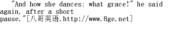 简直像劝只公猫瓦西卡似的。"杰尼索夫诙谐地说。 "I'll sing to you a whole evening," said Natasha." 以后我整个夜晚给您唱歌。"娜塔莎说道。 "The little witch, she can do anything with me!" said Denisov; and he unhooked his sword. He came out from behind the chairs, clasped his partner firmly by the hand, raised his head and stood with one foot behind the other, waiting for the time. It was only on horseback and in the mazurka that Denisov's low stature was not noticeable, and that he looked the dashing hero he felt himself to be. At the right bar in the time he glanced sideways with a triumphant and amused air at his partner, and making an unexpected tap with one foot he bounded springily like a ball from the floor and flew round, whirling his partner round with him. He flew inaudibly across the hall with one leg forward, and seemed not to see the chairs standing before him, darting straight at them; but all at once with a clink of his spurs and a flourish of his foot he stopped short on his heels, stood so a second, with a clanking of spurs stamped with both feet, whirled rapidly round, and clapping the left foot against the right, again he flew round. Natasha's instinct told her what he was going to do, and without herself knowing how she did it, she followed his lead, abandoning herself to him. At one moment he spun her round, first on his right arm, then on his left arm, then falling on one knee, twirled her round him and again galloped, dashing forward with such vehemence that he seemed to intend to race through the whole suite of rooms without taking breath. Then he stopped suddenly again and executed new and unexpected steps in the dance. When after spinning his partner round before her seat he drew up smartly with a clink of his spurs, bowing to her, Natasha did not even make him a curtsey. She looked at him smiling with a puzzled face, as though she did not recognise him." 女魔法师, 想对我怎么办就怎么办吧!"杰尼索夫说, 他摘下马刀。杰尼索夫从几把椅子后面走出来, 紧紧地握住女舞伴的手, 稍微抬起头, 伸出一条腿, 等待着音乐的拍节。只有在骑马和跳玛祖尔卡舞的时候, 才看不清杰尼索夫那矮小的身材, 于是他装出像个连他自己也感觉得到的英姿飒爽的小伙子, 他等待着音乐的拍节, 得意洋洋地、诙谐地从侧面看看自己的舞伴, 忽然间, 他用一只脚轻轻一顿, 便像小皮球似的富有弹力, 从地板上跳起来, 他带着女舞伴沿着那圆形舞池, 飞也似地旋转起来。他用一只脚一声不响地从半个舞厅跑过去, 好像没有看见摆在面前的几把椅子似的, 他于是劲直地向前冲去, 可是, 忽然间两只马刺给撞得叮当地响了一声, 他叉开两腿, 后跟落地, 站着不动, 站了一秒钟。就在马刺的撞击声中, 他的两脚在原地跺得咚咚响, 一面疾速地转动, 一面用左脚轻轻地磕打着右脚, 又沿着圆形舞池飞快地旋舞。娜塔莎正在猜着他打算做点什么事, 而她自己竟然不知道, 怎么会听任他摆布, 跟在他后面走去, 时而他带着她旋转, 时而用右手, 时而用左手, 时而弯屈膝头, 引导她绕着自己转动, 又霍然站立起来, 飞速地向前冲去, 就好像他要不喘气地跑过这几个房间似的, 时而他又忽然停下来, 出人意外地跳出一个新花样。当他在舞伴的座位前面活泼地带着她转动的时候, 他碰击一下马刺, 向她鞠躬了。娜塔莎甚至没有向他行个屈膝礼。她困惑不安地把她的目光凝聚在他身上, 面露微笑, 仿佛不认得他似的。 "What does it mean?" she said." 这究竟是怎么回事呢?"她说。 Although Iogel would not acknowledge this mazurka as the real one, every one was enchanted with Denisov's dancing of it, and he was continually being chosen as partner; while the old gentlemen, smiling, talked about Poland and the good old days. Denisov, flushed with his exertions and mopping his face with his handkerchief, sat by Natasha and would not leave her side all the rest of the ball. 尽管约格尔不认为这是地道的玛祖尔卡舞, 但是人人都赞赏杰尼索夫的技巧, 开始不断地挑选他做舞伴, 老头子也面露微笑, 开始谈论波兰和美好的旧时代。杰尼索夫因跳玛祖尔卡舞而累得满面通红, 他用手绢揩干脸上的汗。在娜塔莎旁边坐下, 舞会上的人都没有离开她。