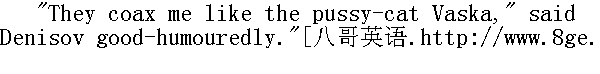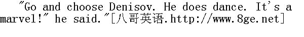 cher comte, vous etes l'un de mes meilleurs ecoliers, il faut que vous danisiez."①矮小的约格尔走到尼古拉跟前, 说道, "Voyez combien de jolies demoiselles.②"他同样地邀请杰尼索夫, 杰尼索夫从前也是他的学生。 ①法语: 亲爱的伯爵, 您是我的优等生之一。您应当跳舞。 ②法语: 您瞧, 有许多美丽的姑娘。 "No, my dear fellow, I will be a wallflower," said Denisov. "Don't you remember how little credit I did to your teaching?" "Non, mon cher, je ferai tapisserie③, "杰尼索夫说, "现在您难道记不得, 我不会应用您教的这门课吗?......" "Oh no!" said Iogel, hastening to reassure him. "You were only inattentive, but you had talent, you had talent."" 噢, 不对!"约格尔连忙安慰他说, "您只是不大用心, 而您是有才华的, 是啊, 您是有才华的。" They began to play the new mazurka. Nikolay could not refuse Iogel, and asked Sonya to dance. Denisov sat down by the elderly ladies, and leaning his elbow on his sword, and beating time with his foot, he began telling something amusing and making the old ladies laugh, while he watched the young ones dancing. Iogel was dancing in the first couple with Natasha, his best pupil and his pride. With soft and delicate movements of his little slippered feet, Iogel first flew across the room with Natasha-shy, but conscientiously executing her steps. Denisov did not take his eyes off her, and beat time with his sword with an air that betrayed, that if he were not dancing it was because he would not, and not because he could not, dance. In the middle of a figure he beckoned Rostov to him. 他们又奏起广为流行的玛祖尔卡曲。尼古拉未能拒绝约格尔, 于是邀请索尼娅跳舞。杰尼索夫在老太婆们旁边坐下来, 用臂肘支在马刀上, 合着拍子跺脚, 他愉快地讲着什么, 惹得老太太们发笑, 他不时地看看跳舞的青年。约格尔和他引以为自豪的优等生娜塔莎结成第一对舞伴跳舞。约格尔从容而且柔和地移动那双穿着短靴皮鞋的小脚, 随同那胆怯、却尽力跳出各种舞步的娜塔莎, 首先在舞厅中翩翩起舞。杰尼索夫目不转睛地望着她, 一面用马刀打拍子, 那模样表明, 他本人不去跳舞只是因为他不愿跳舞, 而不是因为他不会跳舞。在跳舞跳到一半的时候, 他把从他身边走过的罗斯托夫喊到面前来。 "That's not the right thing a bit," he said. "Is that the Polish mazurka? But she does dance splendidly."" 这根本不是那么回事, "他说, "难道这是波兰玛祖尔卡舞么?不过她跳得真妙。" Knowing that Denisov had been renowned even in Poland for his fine dancing of the Polish mazurka, Nikolay ran up to Natasha. 尼古拉知道杰尼索夫甚至在波兰亦以跳波兰玛祖尔卡舞的技能而遐尔闻名, 他跑到娜塔莎跟前说: