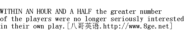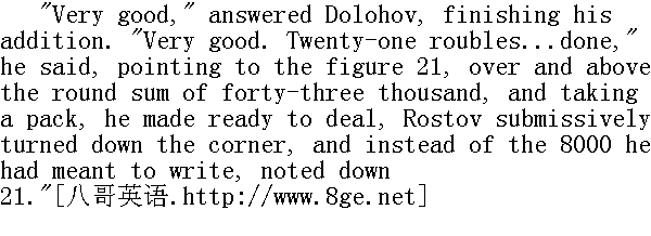 很好, "多洛霍夫结完帐, 说道, "很好!押二十一卢布的赌注, "他指着四万三千一笔整数的零头"二十一"这个数字说, 他拿起一副纸牌, 准备发牌。罗斯托夫顺从地折上纸牌的一角, 用心地写上二十一, 以取代原来准备押的六千。 "It's all the same to me," he said; "only it's interesting to me to know whether you will win on that ten or let me have it."" 我横竖一样, "他说道, "我很想知道的只是, 你要把这个十点'吃'掉, 还是让给我。" Dolohov began seriously dealing. Oh, how Rostov hated at that moment those reddish hands, with their short fingers and the hairs visible under the shirt sleeves, those hands that held him in their clutches....The ten was not beaten. "Forty-three thousand to your score, count," said Dolohov, and he got up from the table stretching. "One does get tired sitting so long," he said. 多洛霍夫开始认真地发牌。哦, 罗斯托夫这时分多么痛恨那双支配他的手, 那双稍微发红的、从衬衣袖筒下面露出来的、指头短短的、长满汗毛的手......十点赢了。"您欠四万三千, 伯爵, "多洛霍夫从桌后站起来, 伸伸懒腰时说道, "不过, 坐得太久了, 会疲倦的。"他说道。 "Yes, I'm tired too," said Rostov." 是的, 我也疲倦了。"罗斯托夫说。 Dolohov cut him short, as though to warn him it was not for him to take a light tone. 多洛霍夫打断他的话, 好像在提醒他, 开玩笑对他是不体面的。