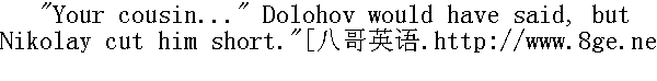 你的表妹......"多洛霍夫想说一句话, 可是尼古拉打断他的话。 "My cousin has nothing to do with the matter, and there is no need to mention her!" he cried, with fury." 我的表妹与此事毫不相干, 用不着谈论她!"他疯狂地喊道。 "Then, when am I to receive it?" asked Dolohov." 那末什么时候可以拿到钱?"多洛霍夫问道。 "To-morrow," said Rostov, and went out of the room." 明天。"罗斯托夫说完这句话, 便从房里走出去了。