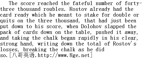 欠帐已高达四万三千这个命中注定不祥的数目。罗斯托夫刚刚输掉三千卢布, 他挑选一张牌, 折上纸牌的一角, 再下四分之一的赌注, 这时多洛霍夫把纸牌往桌上一磕, 挪到一边, 拿起一根粉笔把它摁断, 用那容易辨认的雄健的笔迹开始给罗斯托夫结帐。 "Supper, supper-time. And here are the gypsies." And some swarthy men and women did in fact come in from the cold outside, saying something with their gypsy accent. Nikolay grasped that it was all over; but he said in an indifferent voice:" 该吃晚饭了, 该吃晚饭了!你看, 茨冈人来了!"几个面目黧黑的男女真从寒冷的户外走进来, 带着茨冈人的口音说话。尼古拉明白, 一切都完了, 可是他冷漠地说: "What, won't you go on? And I have such a nice little card all ready." As though what chiefly interested him was the game itself." 怎么, 你不再赌了?我选好了一张好牌。"好像赌博这一娱乐使他最感兴趣似的。 "It's all over, I'm done for," he thought. "Now a bullet through the head's the only thing left for me," and at the same time he was saying in a cheerful voice:" 一切都完了, 我完蛋了!"他想道, "现在只有一条路, 对准额头开一枪自杀吧。"同时他又愉快地说。 "Come, just one more card."" 喂, 再来一张牌吧。"