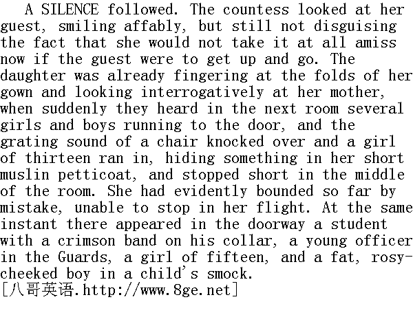 大家都默不作声。伯爵夫人望着女客人, 脸上露出愉快的微笑, 但她并不掩饰那种心情: 如果那个女客人站立起来, 退席离开, 她丝毫也不会感到怏怏不乐。女客的女儿正在弄平连衣裙, 用疑问的眼神望着母亲, 就在这时分, 忽然听见隔壁房里传来一群男人和女人向门口迅跑的步履声、绊倒椅子的响声, 一个十三岁的女孩跑进房里来, 用那短短的纱裙盖住一件什么东西, 她在房间当中停步了。很明显, 她在跑步时失脚, 出乎意料地蹦得这么远。就在这同一瞬间, 一个露出深红色衣领的大学生、一个近卫军军官、一个十五岁的女孩和一个身穿儿童短上衣的面颊粉红的胖乎乎的男孩在那门口露面了。 The prince jumped up, and swaying from side to side, held his arms out wide round the little girl. 伯爵猛然跳起来, 摇摇摆摆地走着, 把两臂伸开, 抱住跑进来的小女孩。 "Ah, here she is!" he cried, laughing. "Our little darling on her fete day!" " 啊, 她毕竟来了!"他含笑地喊道, "过命名日的人!machere过命名日的人!" "My dear, there is a time for everything," said the countess, affecting severity. "You're always spoiling her, Elie," she added to her husband. "machere, ilyauntempspour, tout, " ①伯爵夫人假装出一副严肃的样子, 她说, "你总是溺爱她, 埃利。"她对丈夫补充地说。 ①法语: 一切事情都得有个时间, 亲爱的。