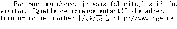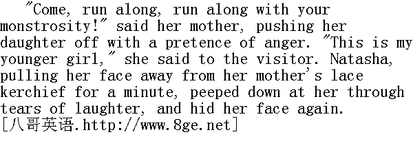 "Bonjour, machere, jevousfelicite, " 女客人说道, "Quelledelicieuseenfant!②"她把脸转向母亲, 补充地说。 ②法语: 我亲爱的, 您好, 向您表示祝贺。多么可爱的小孩子! The dark-eyed little girl, plain, but full of life, with her wide mouth, her childish bare shoulders, which shrugged and panted in her bodice from her rapid motion, her black hair brushed back, her slender bare arms and little legs in lace-edged long drawers and open slippers, was at that charming stage when the girl is no longer a child, while the child is not yet a young girl. Wriggling away from her father, she ran up to her mother, and taking no notice whatever of her severe remarks, she hid her flushed face in her mother's lace kerchief and broke into laughter. As she laughed she uttered some incoherent phrases about the doll, which was poking out from her petticoat. 小姑娘长着一双黑眼睛, 一张大嘴巴, 相貌不漂亮, 但挺活泼。她跑得太快, 背带滑脱了, 袒露出孩子的小肩膀, 黑黝黝的打绺的鬈发披在后面, 光着的手臂十分纤细, 身穿一条钩花裤子, 一双小脚穿着没有鞋带的矮靿皮靴。说她是孩子已经不是孩子, 说她是女郎还不是女郎, 她正值这个美妙的年华。她从父亲的怀抱中挣脱出来, 走到了母亲近旁, 母亲的严厉呵斥她不在乎, 倒把脸儿藏在母亲的花边斗篷里, 不知她为什么而笑, 一面若断若续地说到她从衣裙下面掏出来的洋娃娃。 "Do you see?...My doll...Mimi...you see..." And Natasha could say no more, it all seemed to her so funny. She sank on her mother's lap, and went off into such a loud peal of laughter that every one, even the prim visitor, could not help laughing too. " 你们看见吗?......一个洋娃娃......咪咪......你们都看见。"娜塔莎不能说下去了(她以为一切都很可笑), 她倒在母亲身上, 哈哈大笑起来, 笑声非常响亮, 以致所有的人, 连那个过分拘礼的女客也情不自禁地笑了起来。