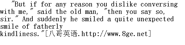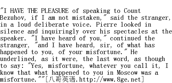 如果我没有出差错, 我有幸正在和别祖霍夫伯爵攀谈。"过路客人从容不迫地大声地说。皮埃尔沉默不言, 用那疑问的目光透过眼镜注视着他的对话人。 "久闻大名, "过路客人继续说, "我也听说阁下遭遇不幸, "他好像强调最后一个词, 好像他说了一句: "是的, 不幸, 不管您是怎样说, 我还是知道, 您在莫斯科发生的事, 是一大不幸, " "I am very sorry for it, sir." Pierre reddened, and hurriedly dropping his legs over the edge of the bed, he bent forward towards the old man, smiling timidly and unnaturally." 阁下, 对此我深表遗憾。"皮埃尔面红耳赤, 急忙从床上放下一双脚, 向老头弯下腰来, 不自然地、畏葸地露出微笑。 "I have not mentioned this to you, sir, from curiosity, but from graver reasons." He paused, not letting Pierre escape from his gaze, and moved aside on the sofa, inviting him by this movement to sit beside him. Pierre disliked entering into conversation with this old man, but involuntarily submitting to him, he came and sat down beside him." 阁下, 我不是出于好奇而向您提到这件事情, 而是因为更重要的缘由。"他沉默半晌, 一直盯着皮埃尔, 坐在沙发上向前移动一下身子, 用这个姿势请皮埃尔在他身旁坐下来。皮埃尔很不愿意和这个老头谈话, 但他情不自禁地顺从他的意思, 走过去, 在他身旁坐下来。 "You are unhappy, sir," he went on, "you are young, and I am old. I should like, as far as it is in my power, to help you."" 阁下, 您很不幸, "他继续说道, "您很年轻, 我已经老了。我愿意竭尽全力地帮助您。" "Oh, yes," said Pierre, with an unnatural smile. "Very much obliged to you ... where have you been travelling from?" The stranger's face was not cordial, it was even cold and severe, but in spite of that, both the speech and the face of his new acquaintance were irresistibly attractive to Pierre." 哎呀, "皮埃尔面露不自然的微笑说, "我很感谢您......请问您从哪里来?"过路客人的面容显得不和蔼, 甚至冷漠而严峻, 虽然如此, 但是新相识的言谈和面容却对皮埃尔产生强烈的魅力。