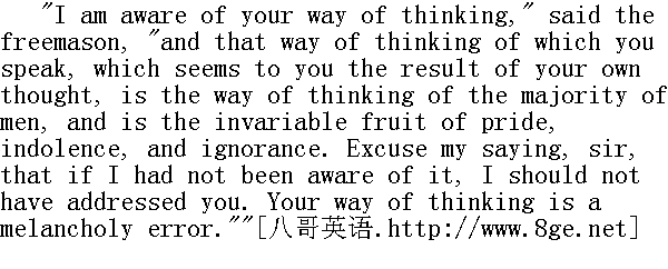 皮埃尔不能, 也不愿意打破这种沉默。 "He exists, but to comprehend Him is hard," the mason began again, not looking into Pierre's face, but straight before him, while his old hands, which could not keep still for inward emotion, turned the leaves of the book. "If it had been a man of whose existence thou hadst doubts, I could have brought thee the man, taken him by the hand, and shown him thee. But how am I, an insignificant mortal, to show all the power, all the eternity, all the blessedness of Him to one who is blind, or to one who shuts his eyes that he may not see, may not understand Him, and may not see, and not understand all his own vileness and viciousness." He paused. "Who art thou? What art thou? Thou dreamest that thou art wise because thou couldst utter those scoffing words," he said, with a gloomy and scornful irony, "while thou art more foolish and artless than a little babe, who, playing with the parts of a cunningly fashioned watch, should rashly say that because he understands not the use of that watch, he does not believe in the maker who fashioned it. To know Him is a hard matter. For ages, from our first father Adam to our day, have we been striving for this knowledge, and are infinitely far from the attainment of our aim; but in our lack of understanding we see only our own weakness and His greatness ..."" 他是存在的, 可是难以理解他。"共济会员又说起话来, 他的眼睛不是向皮埃尔的面庞, 而是向他自己前面望去, 那两只老年人的手翻动着书页, 由于内心的激动, 这双手不能静止不动。"如果他是一个人, 你怀疑这个人的存在, 我可以把他领到你身边来, 一把抓住他的手, 给你瞧瞧。但是我这个微不足道的凡人怎么能向那个盲目的、或者熟视无睹的、不去理解他而且有目也看不清也不明了自己的肮脏行为和缺陷的人展示他的万能、永恒和仁慈呢?他沉默一会儿, "你是什么人?你是什么东西?你自命不凡, 认为你是个贤人, 因为你会道出这些亵渎的话, "他含着阴悒的讥笑说。"你比小孩更愚蠢、更不明事理, 小孩玩耍精工钟表零件时, 会冒失地说他不信任制造钟表的师傅, 其原因是, 他不明了钟表的用途。认识上帝是很困难的。从始祖亚当到我们今天, 许多个世纪以来, 我们一直为这种认识而进行工作, 但是我们还远远未能达到目的, 我们都认为, 不理解上帝只是我们的弱点和他的伟大......" Pierre gazed with shining eyes into the freemason's face, listening with a thrill at his heart to his words; he did not interrupt him, nor ask questions, but with all his soul he believed what this strange man was telling him. Whether he believed on the rational grounds put before him by the freemason, or believed, as children do, through the intonations, the conviction, and the earnestness, of the mason's words, the quiver in his voice that sometimes almost broke his utterance, or the gleaming old eyes that had grown old in that conviction, or the calm, the resolution, and the certainty of his destination, which were conspicuous in the whole personality of the old man, and struck Pierre with particular force, beside his own abjectness and hopelessness,-any way, with his whole soul he longed to believe, and believed and felt a joyful sense of soothing, of renewal, and of return to life. 皮埃尔极度紧张, 用那明亮的眼睛瞅着共济会员的面孔, 听他说下去, 没有打断他的话, 也不问什么, 而是诚心地相信这个陌生人对他说的话。他是否相信共济会员言谈中合乎情理的论据, 或者像儿童一样相信共济会员发言的语调、坚强信念和热忱、相信嗓音的颤抖有时几乎会打断共济会员的发言, 或者相信老年人这对由于信仰而变得衰老的闪闪发亮的眼睛, 或者相信从共济会员整个内心世界中闪耀出光辉的那种沉着和坚定以及对自己使命的认识;与皮埃尔的颓丧和失望相比照, 共济会员的这些特点使皮埃尔大为惊讶, 他诚心地希望确立自己的信念, 而且也这样做了, 他体会到一种安泰、更新和复活的快感。 "It is not attained by the reason, but by life," said the mason." 上帝不是靠智慧所能理解的, 而是要在生活中去理解。"共济会员说。 "I don't understand," said Pierre, feeling with dismay that doubt was stirring within him. He dreaded obscurity and feebleness in the freemason's arguments, he dreaded being unable to believe in him. "I don't understand," he said, "in what way human reason cannot attain that knowledge of which you speak."" 我不明白, "皮埃尔说, 他恐惧地感觉到自己心中升起了疑团。他害怕对话人的模糊不清的、难以令人信服的论据, 他害怕不相信他, "我不明白, "他说道, "人类的智慧怎么不能领悟您所说的知识。"