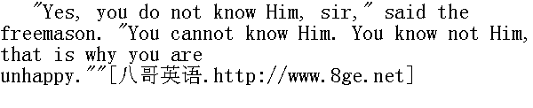 是的, 阁下, 您不知道他, "共济会员说, "您不可能知道他。您不知道他, 所以您也不幸。" "Yes, yes, I am unhappy," Pierre assented; "but what am I to do?"" 是啊, 是啊, 我不幸, "皮埃尔承认, "可是, 我应该怎么办呢?" "You know not Him, sir, and that's why you are very unhappy. You know not Him, but He is here, He is within me, He is in my words, He is in thee, and even in these scoffing words that thou hast just uttered," said the mason in a stern, vibrating voice." 您不知道他, 阁下, 所以您很不幸。您不知道他, 不过他就开这儿, 他在我心中, 他在我的话语中, 他在你心中, 甚至在你甫才说的那些亵渎的话语中。"共济会员用那严肃的、颤抖的声音说。 He paused and sighed, evidently trying to be calm. 他沉默片刻, 叹了一口气, 看来他力图镇静下来。 "If He were not," he said softly, "we should not be speaking of Him, sir. Of what, of whom were we speaking? Whom dost thou deny?" he said all at once, with enthusiastic austerity and authority in his voice. "Who invented Him, if He be not? How came there within thee the conception that there is such an incomprehensible Being? How comes it that thou and all the world have assumed the existence of such an inconceivable Being, a Being all powerful, eternal and infinite in all His qualities? ..." He stopped and made a long pause." 如果他不存在, "他轻声地说, "我和您就不会谈到他, 阁下, 我们谈到的是什么?是谁?你否定谁呢?"他忽然说道, 话音中带有极度兴奋的威严的意味。"既然他不存在, 是谁臆想出来的?为什么在你身上会有一个假设;有这么样的不可理解的内心世界?为什么你和全世界已经推测出这种不可思议的内心世界--具有万能、永恒和无限这些特性的内心世界的存在?......"他停下来, 很久地沉默不言。