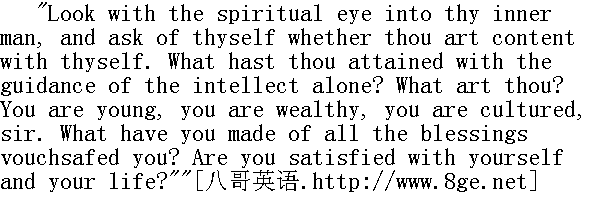 请你用精神的眼睛望望自己的内心, 问问你自己, 你是否满意自己?你单凭智慧获得了什么成就?你是个什么样的人呢?阁下, 您非常年轻、您非常富有、您非常聪明而且有学问。您凭赐予您的这些财富做出了什么事业?您是否满意自己和您自己的生活?" "No, I hate my life," said Pierre, frowning." 不, 我仇恨自己的生活。"皮埃尔皱着眉头说。 "Thou hatest it; then change it, purify thyself, and as thou art purified, thou wilt come to know wisdom. Look at your life, sir. How have you been spending it? In riotous orgies and debauchery, taking everything from society and giving nothing in return. You have received wealth. How have you used it? What have you done for your neighbour? Have you given a thought to the tens of thousands of your slaves, have you succoured them physically and morally? No. You have profited by their toil to lead a dissipated life. That's what you have done. Have you chosen a post in the service where you might be of use to your neighbour? No. You have spent your life in idleness. Then you married, sir, took upon yourself the responsibility of guiding a young woman in life, and what have you done? You have not helped her, sir, to find the path of truth, but have cast her into an abyss of deception and misery. A man injured you, and you have killed him, and you say you do not know God, and that you hate your life. There is no wisdom in all that, sir."" 你仇恨生活, 那末你就改变它吧, 你净化自己吧, 在你净化的时候, 你就会认识智慧。阁下, 您看看自己的生活吧。您是怎样过活的?在狂欢暴饮和淫逸的生活中, 您向社会得到一切, 却未为它作出任何贡献。您得到了财富。您是怎样花掉的?您为他人作了什么?您是否为几万奴隶着想?您是否在智力和体力上帮了他们的忙?并没有。您享用他们的劳动, 过着淫荡的生活。您就是干了这种勾当。您是否已经选择了一个服务地点, 在那里您可以给他人带来好处?并没有。您是过着游手好闲的生活。您后来结婚了, 阁下, 承担了教导年轻妇女的责任, 您究竟做了什么呢?您没有帮助她寻找真理的道路, 却使她陷入虚伪和不幸的深渊。有个人侮辱您, 您竟然把他打死, 您说您不知道上帝, 您仇视自己的生活。阁下, 这里头没有什么不易于了解的东西!" After these words the freemason leaned his elbow again on the back of the sofa and closed his eyes, as though weary of prolonged talking. Pierre gazed at that stern, immovable, old, almost death-like face, and moved his lips without uttering a sound. He wanted to say, "Yes, a vile, idle, vicious life," and he dared not break the silence. The freemason cleared his throat huskily, as old men do, and called his servant. 说完这些话之后, 共济会员好像由于不停地谈天, 谈得太久, 谈疲倦了, 他又把胳膊肘支撑在沙发背上, 合拢了眼睛。皮埃尔注视这个老年人的很严肃的、一动不动的、几乎露出死色的面孔, 他的嘴唇不出声地颤动着。他想这样说: 是的, 这是令人厌恶的、淫荡的、闲逸的生活, --他不敢打破沉默。共济会员老态龙钟地、嗓子嘶哑地咳嗽几声, 清清喉咙, 又向仆人喊了一声。 "How about horses?" he asked, without looking at Pierre." 驿马怎么样了?"他不看皮埃尔一眼, 便问道。
