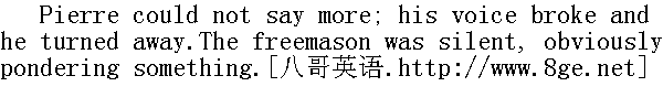 皮埃尔不能继续说下去, 他从鼻子里发出喘息声, 转过身去。 "Help comes only from God," he said, "but such measure of aid as it is in the power of our order to give you, it will give you, sir. You go to Petersburg, and give this to Count Villarsky" (he took out his notebook and wrote a few words on a large sheet of paper folded into four). "One piece of advice let me give you. When you reach the capital, devote your time at first there to solitude and to self-examination, and do not return to your old manner of life. Therewith I wish you a good journey, sir," he added, noticing that his servant had entered the room, "and all success ..."" 只有上帝才会助人, "他说, "但是阁下, 上帝赐予您的, 却是我们共济会有权赐予的帮助。您到彼得堡去, 把这样东西交给维拉尔斯基伯爵(他掏出一个公文夹, 在一大张四折纸上写了几个字)。请允许我给您一个忠告。到达首都后, 初时要闭门幽居, 检讨自己, 不宜走上从前的生活道路。然后祝您一路福星, 事业成功......阁下。"他发觉他的仆人走进房里以后, 说了这句话。 The stranger was Osip Alexyevitch Bazdyev, as Pierre found out from the overseer's book. Bazdyev had been one of the most well-known freemasons and Martinists even in Novikov's day. For a long while after he had gone, Pierre walked about the station room, neither lying down to sleep nor asking for horses. He reviewed his vicious past, and with an ecstatic sense of beginning anew, pictured to himself a blissful, irreproachably virtuous future, which seemed to him easy of attainment. It seemed to him that he had been vicious, simply because he had accidentally forgotten how good it was to be virtuous. There was left in his soul not a trace of his former doubts. He firmly believed in the possibility of the brotherhood of man, united in the aim of supporting one another in the path of virtue. And freemasonry he pictured to himself as such a brotherhood. 皮埃尔从驿站长的旅客登记簿上获悉, 这个过路客人就是奥西普·阿列克谢耶维奇·巴兹杰耶夫。巴兹杰耶夫早在诺维科夫时期就是最闻名的共济会员和马工派神秘教徒。他走后过了很久, 皮埃尔并没有就寝, 也没有去要换乘的马匹, 就在驿站上的房间里踱来踱去, 回想(他自己耽于淫逸的往事, 并且怀着革新的喜悦, 想象到那个他认为惬意的、安乐的、无瑕可剔的、注重德行的未来。他仿佛觉得, 他之所以行为不端, 只是因为他偶尔忘却做一个道德高尚的人是多么优秀罢了。他的心灵中不再残存有以前那种怀疑的印迹了。他坚信, 人们在通往美德的途中, 以互相扶持为目的而和衷共济是切实可行的, 他想象中的共济会就是如此的。