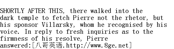 嗣后不久, 已经不是以前的修辞班教师, 而是保证人维拉尔斯基走到了这座昏暗的富丽堂皇的宫殿来寻找皮埃尔, 皮埃尔一听见保证人的嗓音就认出他了。皮埃尔对再次提出有关他的志向是否坚定的问题, 他作了如下的答复: "Yes, yes, I agree," and with a beaming, childlike smile he walked forward, stepping timidly and unevenly with one booted and one slippered foot, while Villarsky held a sword pointed at his fat, uncovered chest. He was led out of the room along corridors, turning backwards and forwards, till at last he was brought to the doors of the lodge. Villarsky coughed; he was answered by masonic taps with hammers; the door opened before them. A bass voice (Pierre's eyes were again bandaged) put questions to him, who he was, where and when he was born, and so on. Then he was again led away somewhere with his eyes still bandaged, and as he walked they spoke to him in allegories of the toils of his pilgrimage, and of holy love, of the Eternal Creator of the world, of the courage with which he was to endure toils and dangers. During this time Pierre noticed that he was called sometimes the seeker, sometimes the sufferer, and sometimes the postulant, and that they made various tapping sounds with hammers and with swords. While he was being led up to some object, he noticed that there was hesitation and uncertainty among his conductors. He heard a whispered dispute among the people round him, and one of them insisting that he should be made to cross a certain carpet. After this they took his right hand, laid it on something, while they bade him with the left hold a compass to his left breast, while they made him repeat after some one who read the words aloud, the oath of fidelity to the laws of the order. Then the candles were extinguished and spirit was lighted, as Pierre knew from the smell of it, and he was told that he would see the lesser light. The bandage was taken off his eyes, and in the faint light of the burning spirit Pierre saw, as though it were in a dream, several persons who stood facing him in aprons like the rhetor's, and held swords pointed at his breast. Among them stood a man in a white shirt stained with blood. On seeing this, Pierre moved with his chest forward towards the swords, meaning them to stab him. But the swords were drawn back, and the bandage was at once replaced on his eyes." 是的, 是的, 我同意, "他像儿童似的笑容可掬, 露出肥胖的胸脯, 一只脚穿着皮靴, 另一只脚没有穿, 他迈着不平稳的、畏葸的步子, 挨近维拉尔斯基对准他那裸露的胸前伸出的长剑走去。有人把他从房里领出来, 在走廊上转来转去, 最后把他领到分会的门口。维拉尔斯基咳嗽了一声, 有人用共济会特制的槌子咚咚地敲打几下, 作为对他的回答, 他们前面的那扇门敞开了。有个具有男低音嗓子的人(皮埃尔的眼睛仍旧被蒙着)向他提出几个问题: 他是什么人、在何处定居、在何时出生等等。后来又把他领到什么地方, 没有给他解开蒙住眼睛的手绢, 在他行走的时候, 有人对他说几句含有寓意的话: 巡礼中的艰苦、神圣的友谊、亘古永存的创世主, 勇敢(他应该勇敢地忍受艰苦和危险)。这次巡礼时, 皮埃尔发现, 有人时而称他为·求·道·者, 时而称他为·受·难·者, 时而称他为·请·愿·者, 称呼他时, 有人用槌子和长剑敲出各种不同的响声。当人家把他领到一件东西前面时, 他发觉引导人之间发生慌乱。他听见周围的人低声地争论起来, 有一人固执己见, 硬要领着他从地毯上走过去。之后他们握住他的右手, 把它放在一件什么东西上面, 叫他用左手把一只圆规紧紧地贴在左胸上, 吩咐他重复地说出别人念的忠于共济会法规的誓言。然后吹熄了几根蜡烛, 点燃了酒精(皮埃尔闻到了气味), 他们并且说, 他将能看见一小束光线。他们取下了蒙住他眼睛的手绢, 皮埃尔犹如在梦中一样, 在那微弱的酒精火焰的光线照耀下, 看见几个人, 他们就像修辞班教师那样, 都穿着围裙, 站在他对面, 手里拿着几柄对准他的胸膛的长剑。有一人穿着一件血迹斑斑的白衬衫, 站在他们之间。皮埃尔见状, 挺起胸膛, 移动脚步, 迎着几柄长剑走去, 想让那长剑刺入他的胸膛。但是那把长剑避开他了, 有人又立即给他蒙上眼睛。 "Now you have seen the lesser light," said a voice. Then again they lighted the candles, told him that he had now to see the full light, and again removed the bandage, and more than ten voices said all at once: "Sic transit gloria mundi."" 现在你看见了一小束光线, "可以听见某人对他说。然后他们又点燃蜡烛, 并且对他说, 要他看见充足的光线, 他们又给他拿下蒙住眼睛的手绢, 并有十多个人忽然齐声地说: "sic transit gloria mandi。"① ①拉丁语: 尘世的光荣就这样渐渐消逝。 Pierre gradually began to regain his self-possession, and to look about at the room and the people in it. Round a long table covered with black were sitting some dozen men, all in the same strange garment that he had seen before. Several of them Pierre knew in Petersburg society. In the president's chair sat a young man, with a peculiar cross on his neck, whom he did not know. On his right hand sat the Italian abbe whom Pierre had seen two years before at Anna Pavlovna's. There were among them a dignitary of very high standing and a Swiss tutor, who had once been in the Kuragin family. All preserved a solemn silence, listening to the president, who held a hammer in his hand. In the wall was carved a blazing star; on one side of the table was a small rug with various figures worked upon it; on the other was something like an altar with the gospel and a skull on it. Round the table stood seven big ecclesiastical-lo