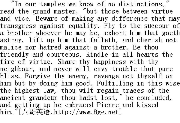 我们的神殿里, "分会会长宣读, "除开位于美德和恶德之间的等级而外, 我们不承认任何其他等级。当心不要造成损害平等的某种差别。务须飞奔去帮助师兄师弟, 不论他是什么人, 必须训导误入迷途的人, 扶起跌倒的人, 永远不应怀恨或敌视师兄师弟。人人要和蔼可亲。在人人心中点燃起美德的火焰。并与他人分享幸福, 永远不让妒嫉扰乱这种纯洁的乐事。""请宽恕你的敌人, 不要复仇, 你只有对他行善, 以这种方式执行至高无上的教规, 你就能遍寻你所失去的古代庄严和雄伟的遗迹。"他说完这些话后, 欠了欠身, 拥抱皮埃尔, 吻吻他。 Pierre looked round with tears of joy in his eyes, not knowing how to answer the congratulations and greetings from acquaintances with which he was surrounded. He did not recognise any acquaintances; in all these men he saw only brothers, and he burned with impatience to get to work with them. The grand master tapped with his hammer, all sat down in their places, and one began reading a sermon on the necessity of meekness. 皮埃尔的眼睛里含着喜悦的泪水, 环顾四周, 不知道怎样回答他周围的人们的祝贺, 不知道怎样回答从新结识之后有何印象。他不去承认任何相识, 只把一切人看作师兄师弟, 并且急不可待地要和他们一道着手工作。分会会长敲了一下槌子, 大家都各自入座, 其中一人宣读有关谦逊的必要性的训词。 The grand master proposed that the last duty be performed, and the great dignitary whose duty it was to collect the alms began making the round of all the brothers. Pierre would have liked to give to the list of alms all the money he had in the world, but he feared thereby to sin by pride, and only wrote down the same sum as the others. 分会会长建议大家履行最后的义务, 那个号称为布施募集人的显要官吏从师兄师弟身边绕了一圈。皮埃尔很想把他拥有的全部钱财写在布施名册上, 但是他怕这样做会显得个人高傲, 他于是写了和别人同样多的捐款。 The sitting was over, and it seemed to Pierre on returning home that he had come back from a long journey on which he had spent dozens of years, and had become utterly changed, and had renounced his old habits and manner of life. 会议结束了, 皮埃尔回家后仿佛觉得他从一次远途旅行归来, 仿佛在途中过了几十年, 他完全变了, 落后于从前的生活秩序和习惯。