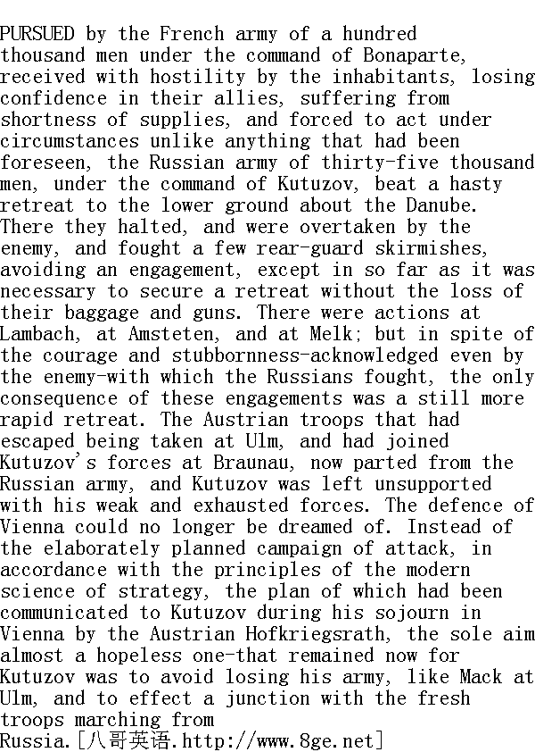 库图佐夫统率的三万五千官兵的俄国军队, 在波拿巴指挥的十万法国军队追击时受到怀有敌意的居民的冷遇, 深感军队粮饷的不足, 已不再信任盟国, 俄军不顾预见到的战争环境, 被迫采取军事行动, 遂经由多瑙河下游仓惶退却, 而在敌军追赶的地区却停止前进, 仅为配合撤退, 不损失重型装备才开展后卫战斗。在兰巴赫、阿姆施特滕、梅尔克附近双方曾经作战, 俄军与敌军交锋时英勇刚毅, 已为敌军所公认;虽然如此, 但是这几次战役均以俄军迅速撤退而告终。奥国军队在乌尔姆附近虽幸免被俘, 并与库图佐夫在布劳瑙会师, 而现今竟与俄国军队分立。库图佐夫兵力不足, 装备很差, 疲惫不堪, 只得听之任之了。保卫维也纳的事已无可考虑。库图佐夫在维也纳期间, 奥国军事参议院曾经送交他一份依据新科学规律酌情拟定的进攻性战略方案, 但是目前库图佐夫部下向他提出的一项近乎难以达到的目标却已摒除以上的战略, 其旨意在于联合来自俄国的军队, 不重蹈马克在乌尔姆近郊损兵折将、全军被歼的覆辙。 On the 28th of October, Kutuzov took his army across to the left bank of the Danube, and then for the first time halted, leaving the Danube between his army and the greater part of the enemy's forces. On the 30th he attacked Mortier's division, which was on the left bank of the Danube, and defeated it. In this action for the first time trophies were taken-a flag, cannons, and two of the enemy's generals. For the first time, after retreating for a fortnight, the Russian troops had halted, and after fighting had not merely kept the field of battle, but had driven the French off it. Although the troops were without clothing and exhausted, and had lost a third of their strength in wounded, killed, and missing; although they had left their sick and wounded behind on the other side of the Danube, with a letter from Kutuzov commending them to the humanity of the enemy; although the great hospitals and houses in Krems could not contain all the sick and wounded,-in spite of all that, the halt before Krems and the victory over Mortier had greatly raised the spirits of the troops. Throughout the whole army, and also at headquarters, there were the most cheerful but groundless rumours of the near approach of the columns from Russia, of some victory gained by the Austrians, and of the retreat of Bonaparte panic-stricken. 十月二十八日, 库图佐夫带领军队横渡多瑙河抵达左岸, 头一次驻扎下来, 与法国人的主力分据于多瑙河两岸。三十日, 库图佐夫攻打驻守在多瑙河左岸的莫蒂埃师团, 把它击溃了。在这次战役中, 头一回赢得了战利品: 军旗、大炮和两名敌军将领。在两个星期的撤退之后, 俄国军队头一次留驻下来, 在一场争斗以后, 不仅守住了战地, 而且驱逐了法国人。虽然这些军队缺少衣服, 疲惫不堪, 掉队、伤亡和患病的人员占三分之一, 削弱了兵力;虽然一些伤病员持有库图佐夫的手谕留在多瑙河对岸(手谕中暗示: 听任敌人赐予他们仁慈的照拂);虽然克雷姆斯的大病院和住房都已变成军医院, 但是仍然容纳不了全部伤病员, 尽管如此, 在克雷姆斯驻留和对莫蒂埃的胜利在颇大程度上提高了部队的士气。在全军之中和在大本营中都散布着令人喜悦、虽然并非真实的传闻, 说什么俄国纵队即将来临、奥国人赢得大捷, 吓破胆的波拿巴撤退了。 Prince Andrey had been during the engagement in attendance on the Austrian general Schmidt, who was killed in the battle. His horse had been wounded under him, and he had himself received a slight wound on his arm from a bullet. As a mark of special favour on the part of the commander-in-chief, he was sent with the news of this victory to the Austrian court, now at Brunn, as Vienna was threatened by the French. On the night of the battle, excited, but not weary (though Prince Andrey did not look robustly built, he could bear fatigue better than very strong men), he had ridden with a despatch from Dohturov to Krems to Kutuzov. The same night he had been sent on with a special despatch to Brunn. This commission, apart from its reward, meant an important step in promotion. 作战期间, 安德烈公爵曾在这次战役中捐躯的奥地利将军施米特身边服役。他骑的马负了伤, 他本人也被子弹擦伤一只手, 伤势轻微。多亏总司令给予特殊照顾, 他携带大捷的消息被派至奥国宫廷;法国军队的威胁引起宫廷恐惧, 奥国宫廷已经不在维也纳, 而在布吕恩。作战的深夜, 安德烈公爵激动不安, 并不感到困倦, 虽然看起来他的身体虚弱, 但是他比那些最强壮的人更能经受住劳累, 他骑上马, 随身带着多赫图罗夫的情报前往克雷姆斯晋谒库图佐夫。当天夜晚安德烈公爵充当信使被派往布吕恩。执行信使这一职务, 除获得奖励而外, 还意味他向升迁的路上迈出一大步。 The night was dark and starlit; the road looked black in the white snow that had fallen on the day of the battle. With his mind filled with impressions of the battle, joyful anticipations of the effect that would be produced by the news of the victory, and recollections of the farewells of the commander-in-chief and his comrades, Prince Andrey trotted along in a light posting cart, with the sensations of a man who, after long waiting, has at last attained the first instalment of some coveted happiness. As soon as he closed his eyes, the firing of guns and cannons was echoing in his ears, and that sound blended with the rattle of the wheels and the sensation of victory. At one moment he would begin to dream that the Russians were flying, that he was himself slain; but he waked up in haste, and with fresh happiness realised anew that t
